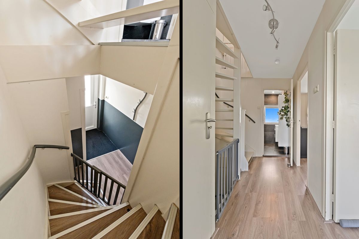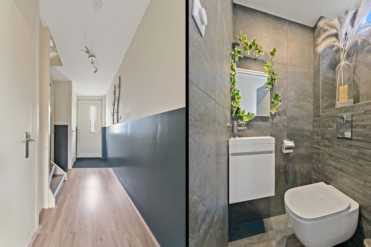 Voortuin, entree woning, hal geeft toegang tot modern toilet, meterkast, praktische trapkast, trapopgang naar de 1e verdieping en de woonkamer.