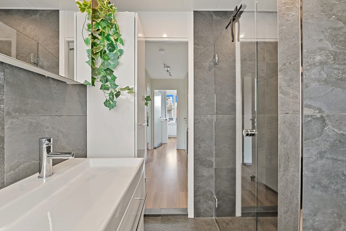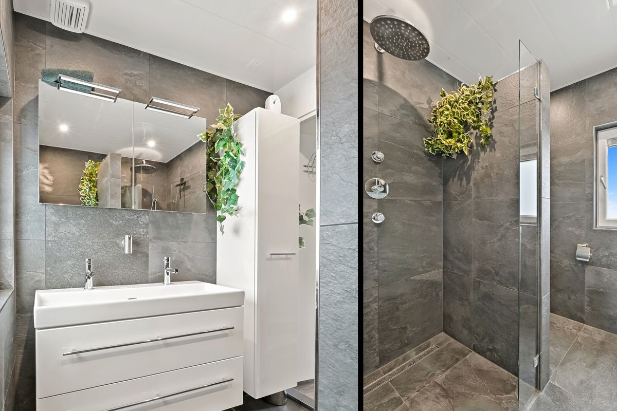 Hoofdslaapkamer en de badkamer aan de voorzijde. De moderne badkamer is uitgerust met wastafel met meubel, 2e toilet, inloopdouche en beschikt over een raam voor natuurlijke ventilatie.
