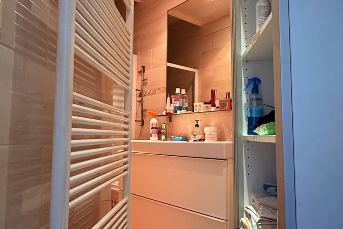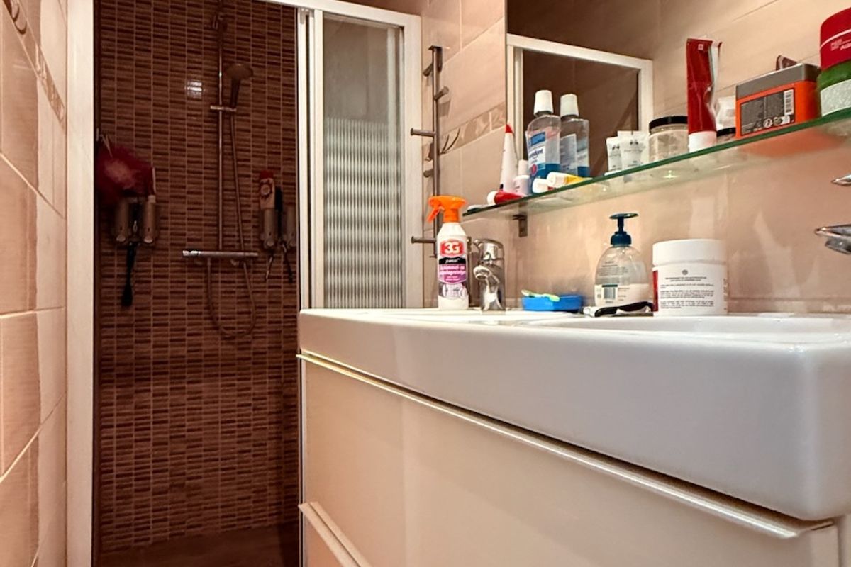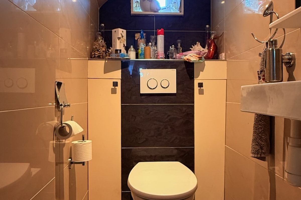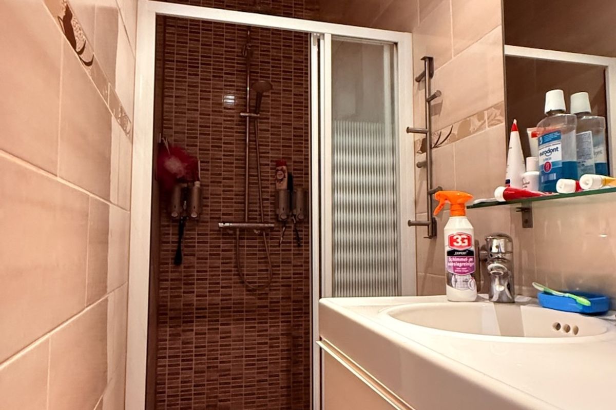 De badkamer heeft een douchecabine en wastafelmeubel; het toilet is separaat.