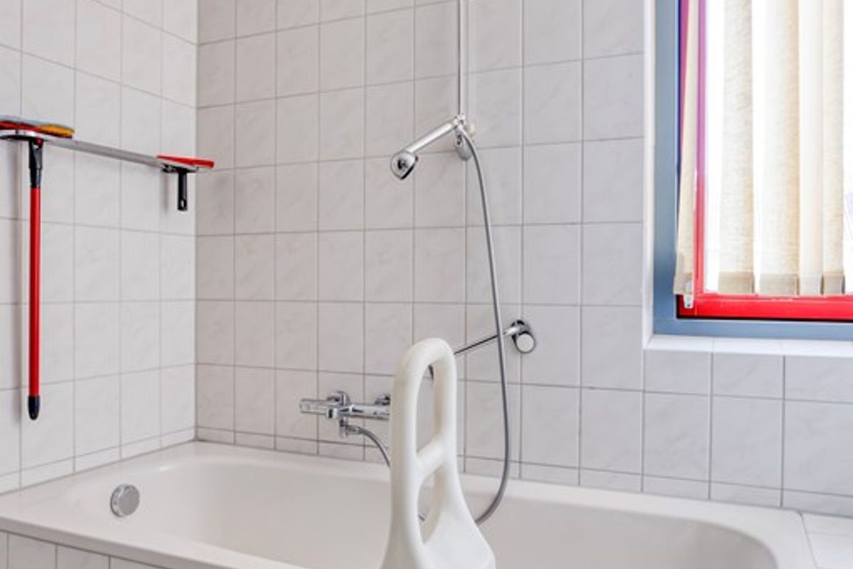 De gehele badkamer is volledig betegeld en voorzien van douchecabine, ligbad, toilet en een wastafel.