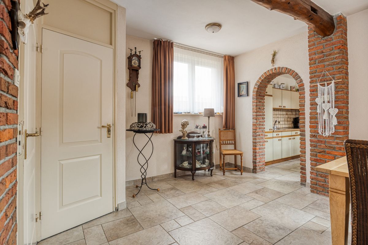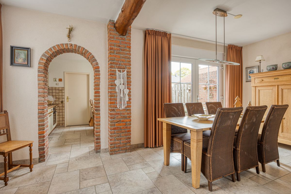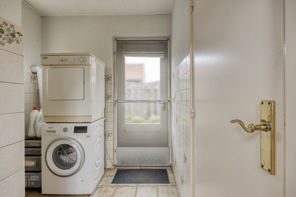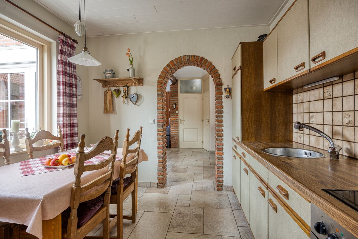 De keuken (ca. 9 m²) is eveneens voorzien van een tegelvloer met vloerverwarming en een keukenopstelling met apparatuur (elektrische kookplaat, afzuigkap, oven, koelkast) en beschikt over voldoende werk- en kastruimte. Aansluitend aan de keuken is de bijkeuken (ca. 6 m²) gesitueerd. Deze is voorzien van een tegelvloer, de witgoedaansluitingen en loopdeuren naar de oprit en naar de tuin. Hier bevindt zich ook de toiletruimte welke voorzien is van een wandcloset met fonteintje.