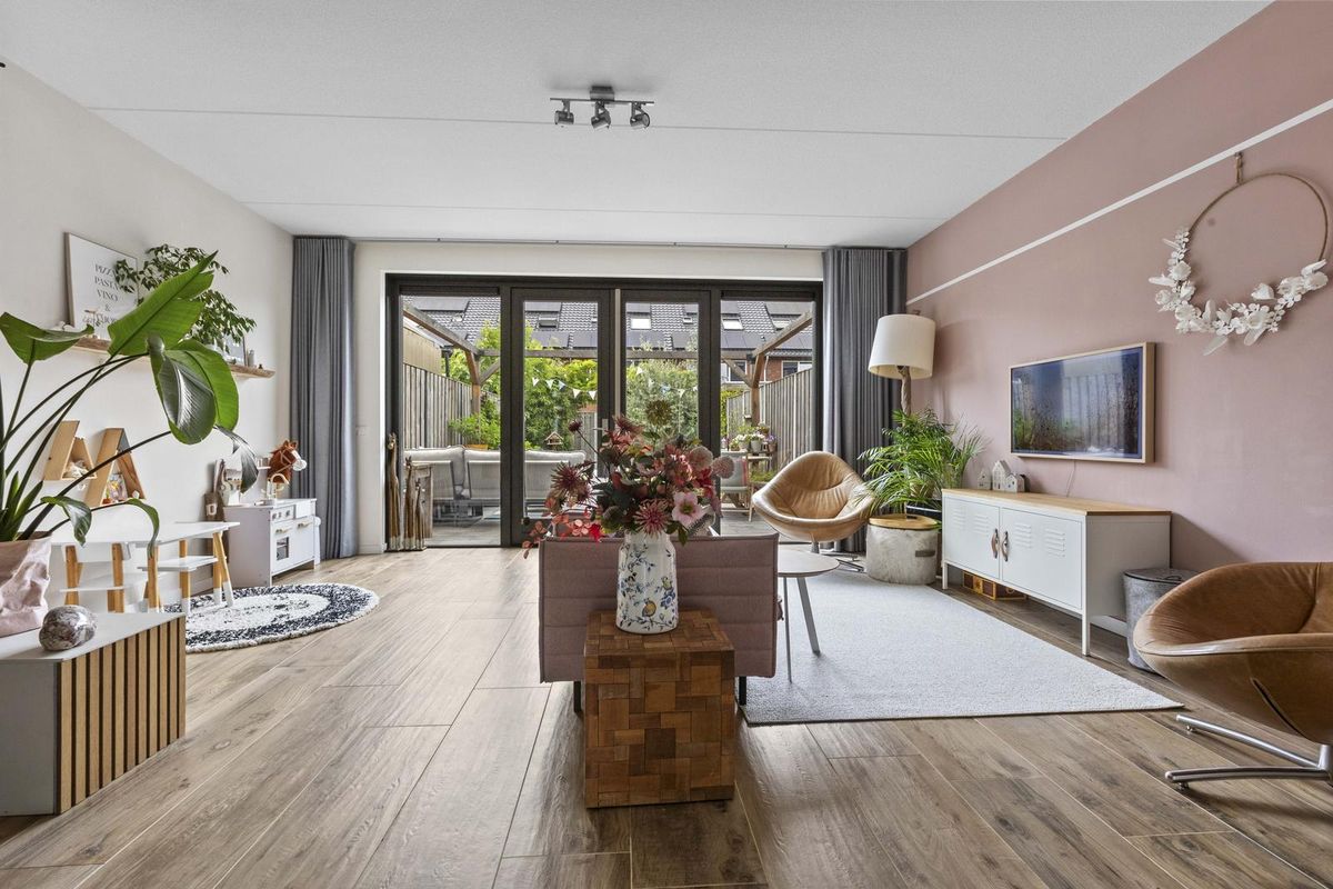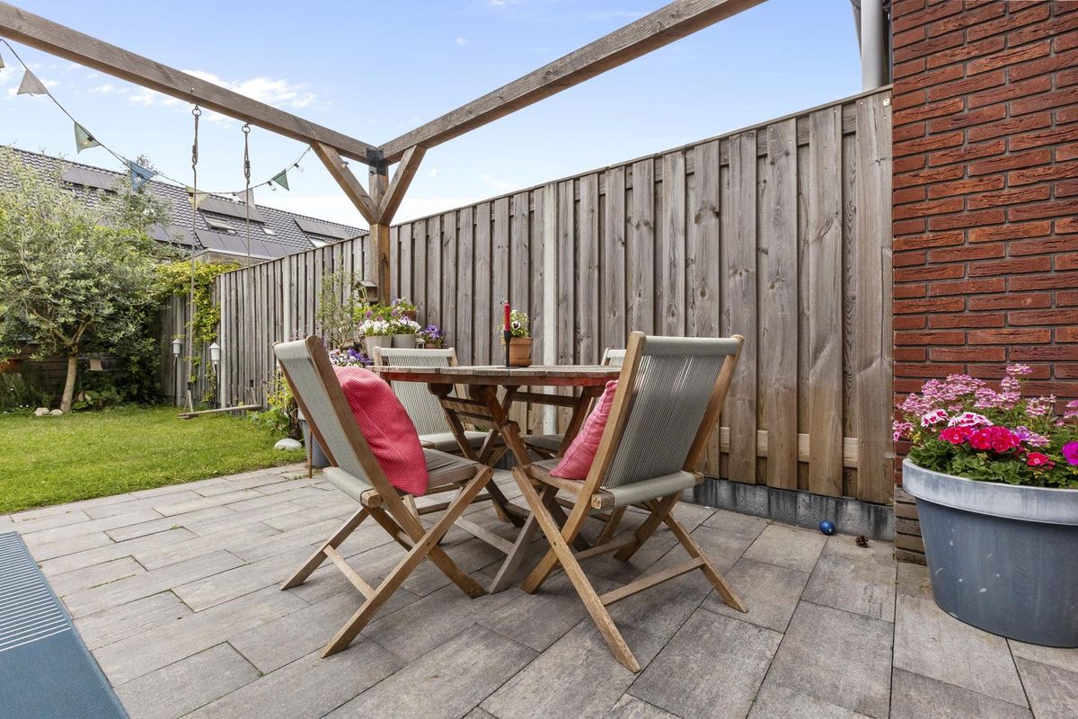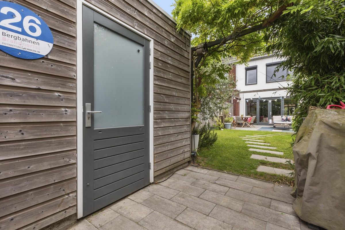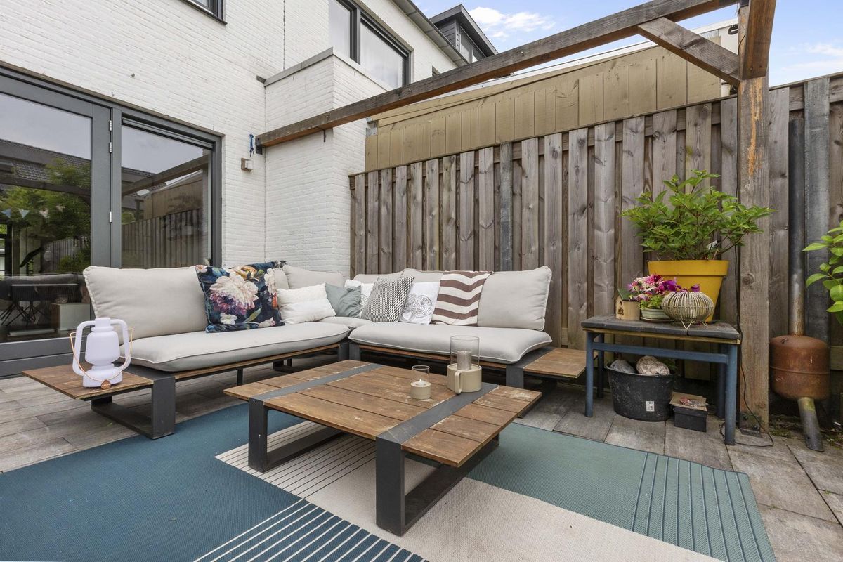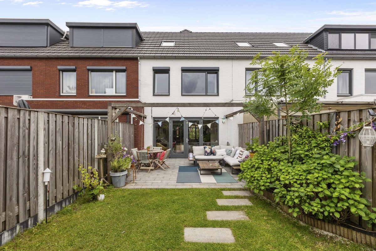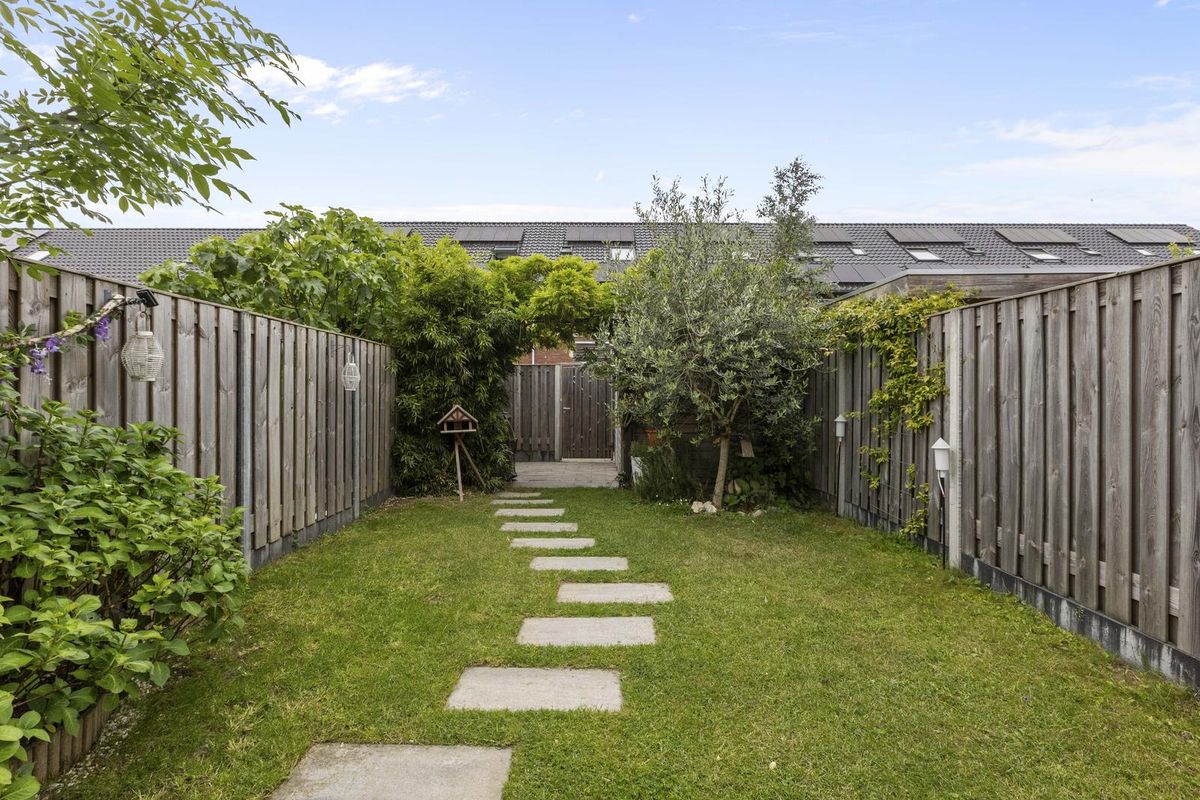 Buitenruimte: aan de achtergevel biedt een groot terras voldoende ruimte voor een zit- en/of eethoek. De heerlijke groene tuin is verder ingericht met een sfeervolle pergola, gazon met stapstenen, houten erfafscheidingen, border, tweede pergola met blauwe regen nabij de olijvenboom, tweede terras, vrijstaande houten berging (v.v. elektriciteit) en een afsluitbare poort achterom.