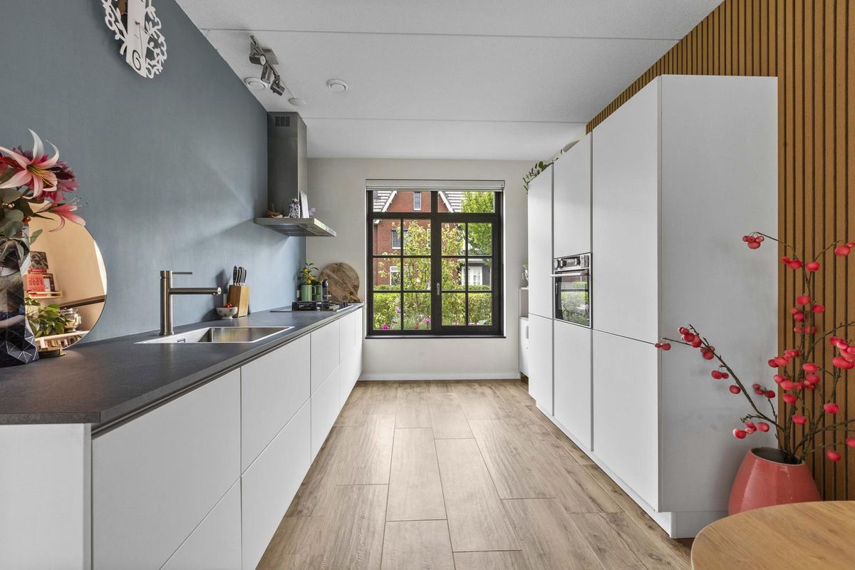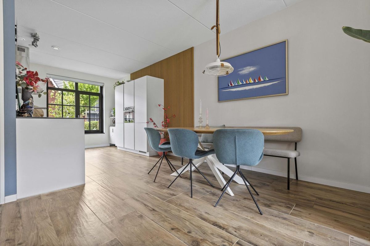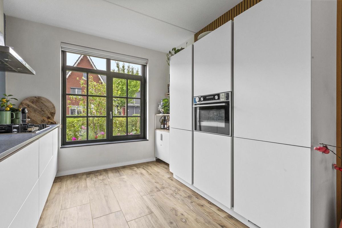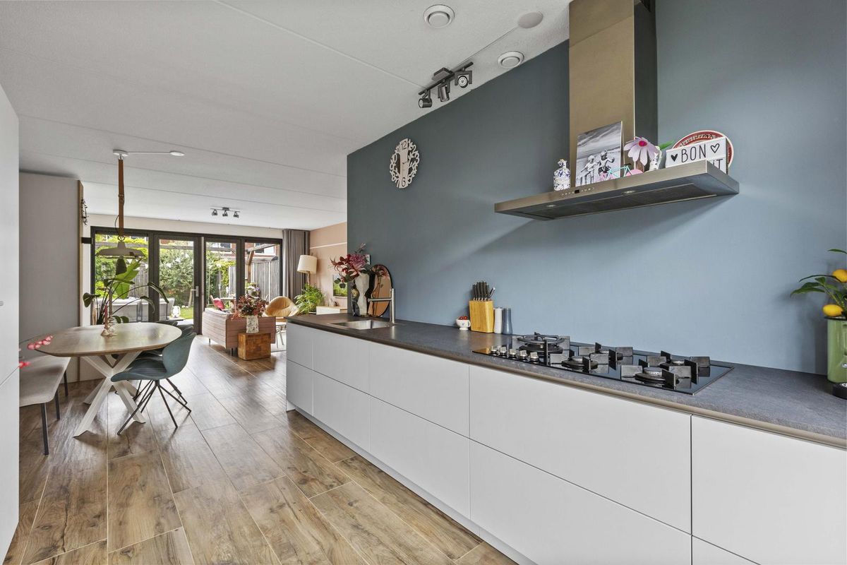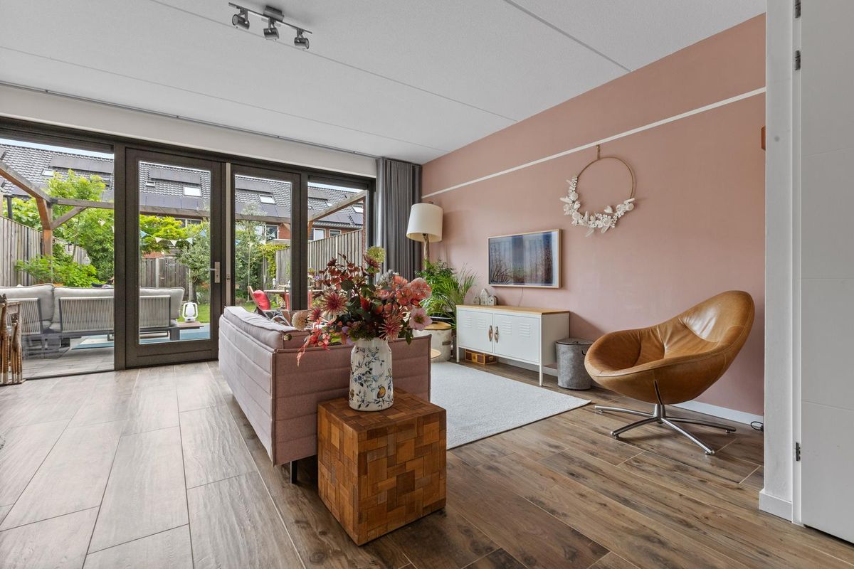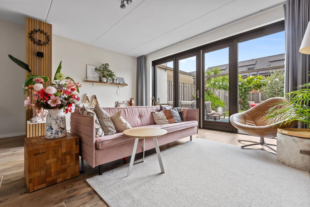 Buitenruimte: aan de achtergevel biedt een groot terras voldoende ruimte voor een zit- en/of eethoek. De heerlijke groene tuin is verder ingericht met een sfeervolle pergola, gazon met stapstenen, houten erfafscheidingen, border, tweede pergola met blauwe regen nabij de olijvenboom, tweede terras, vrijstaande houten berging (v.v. elektriciteit) en een afsluitbare poort achterom.