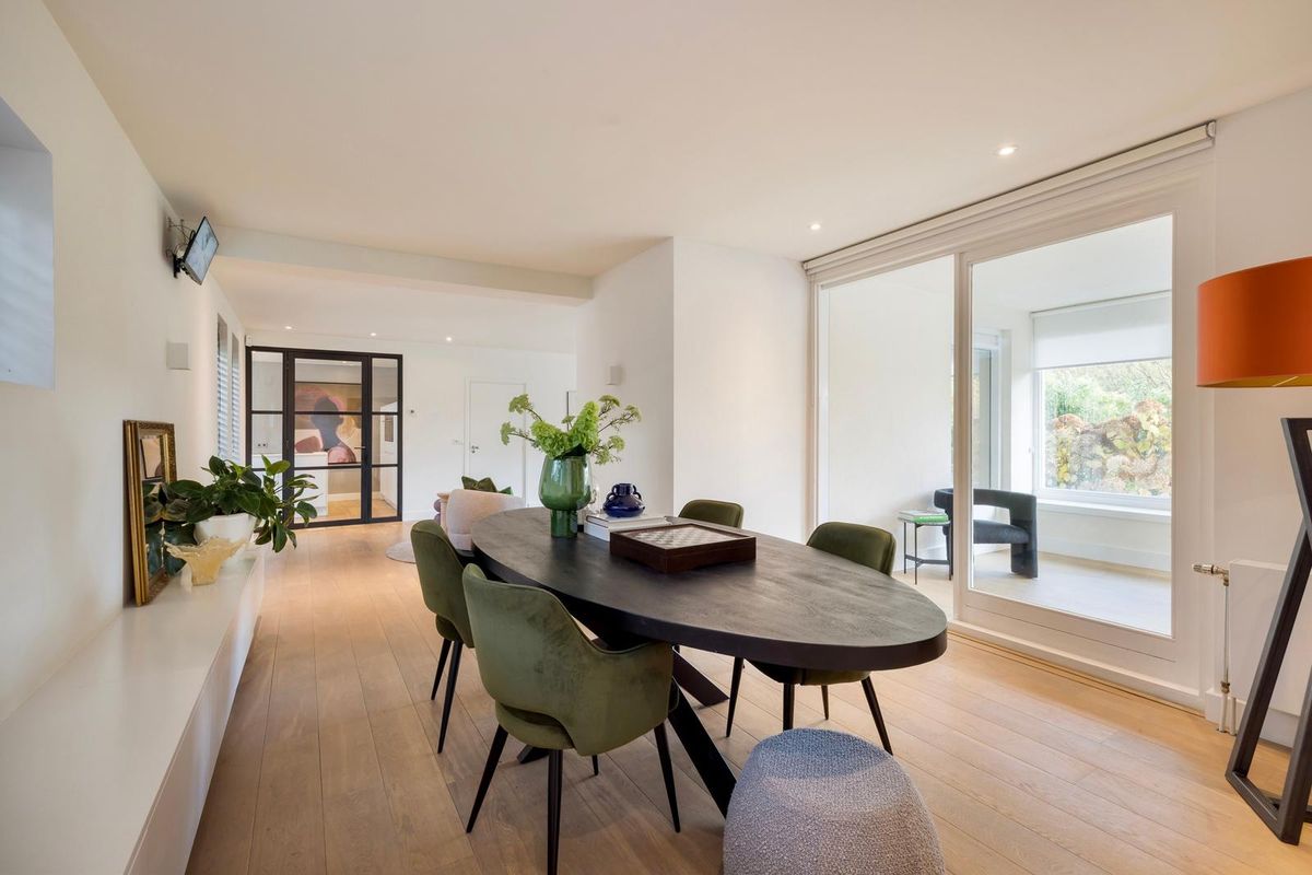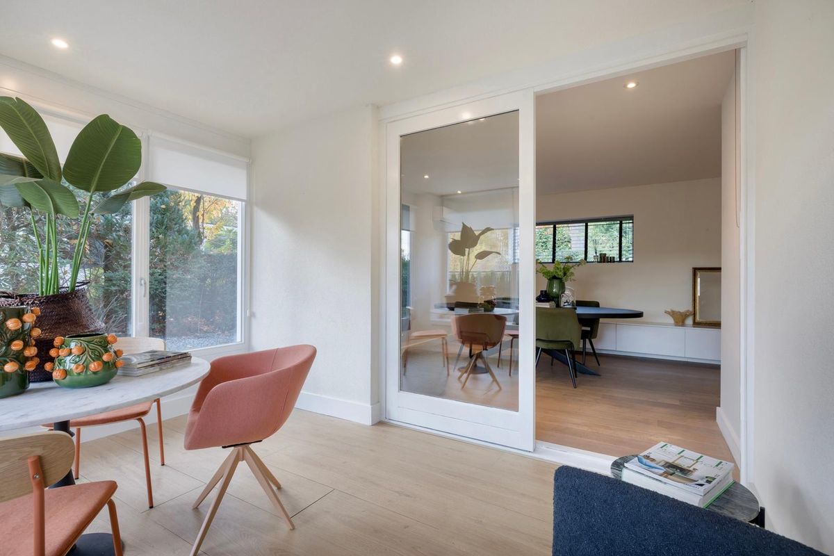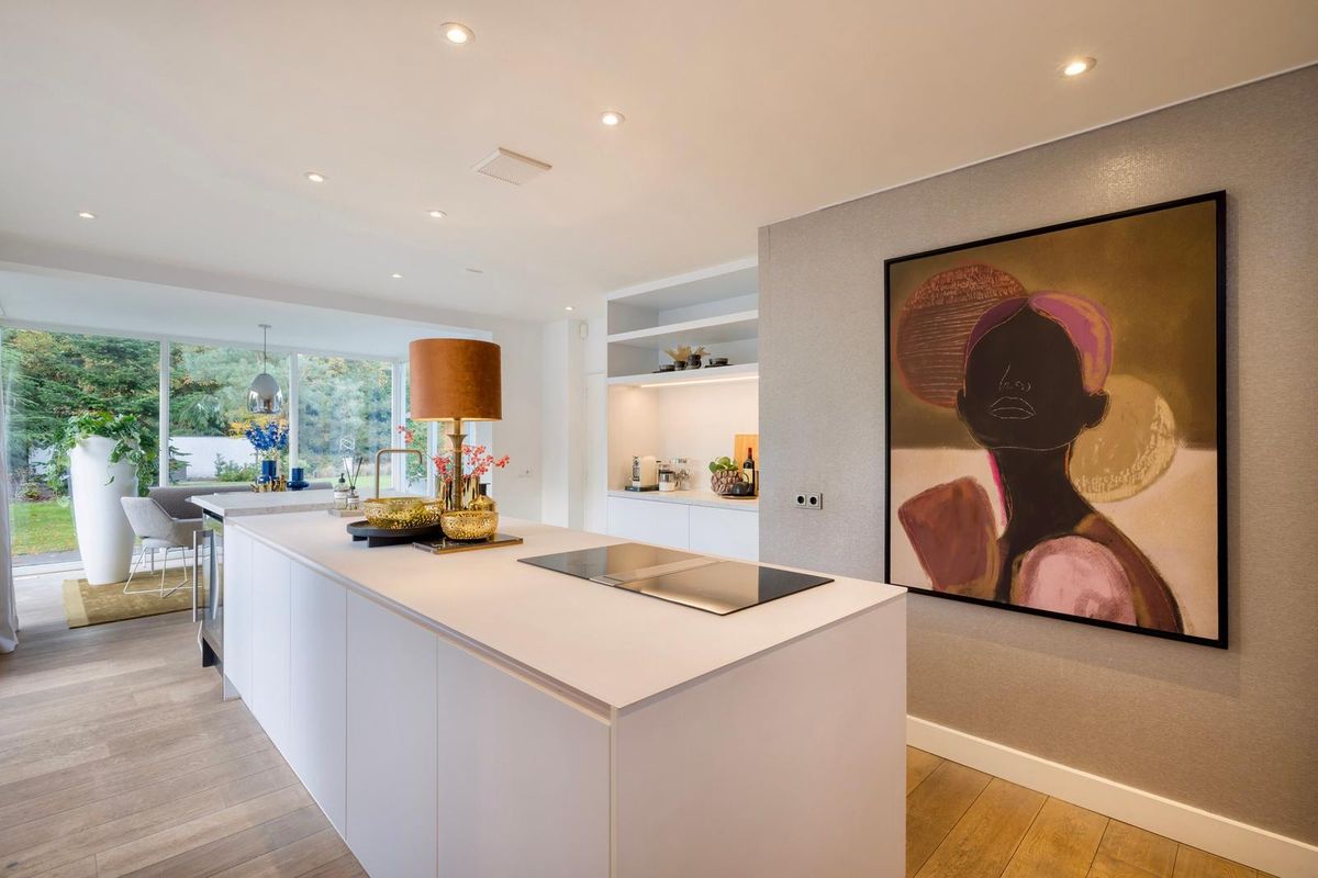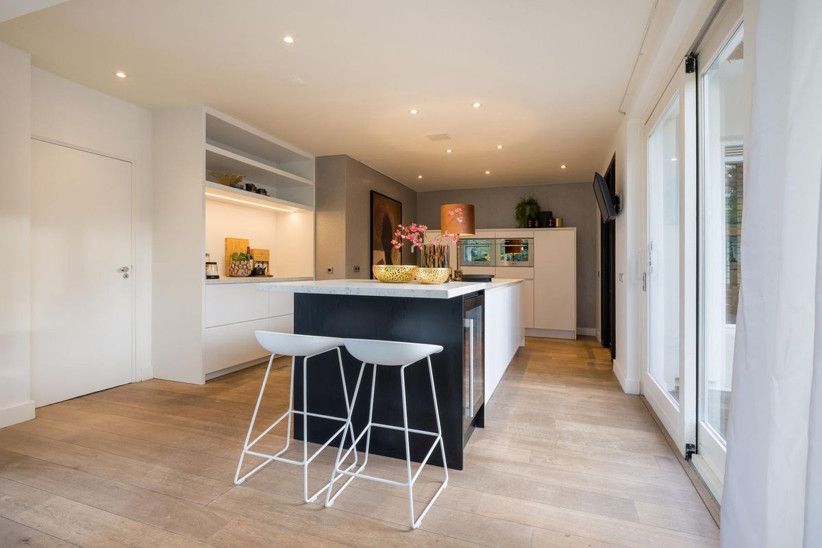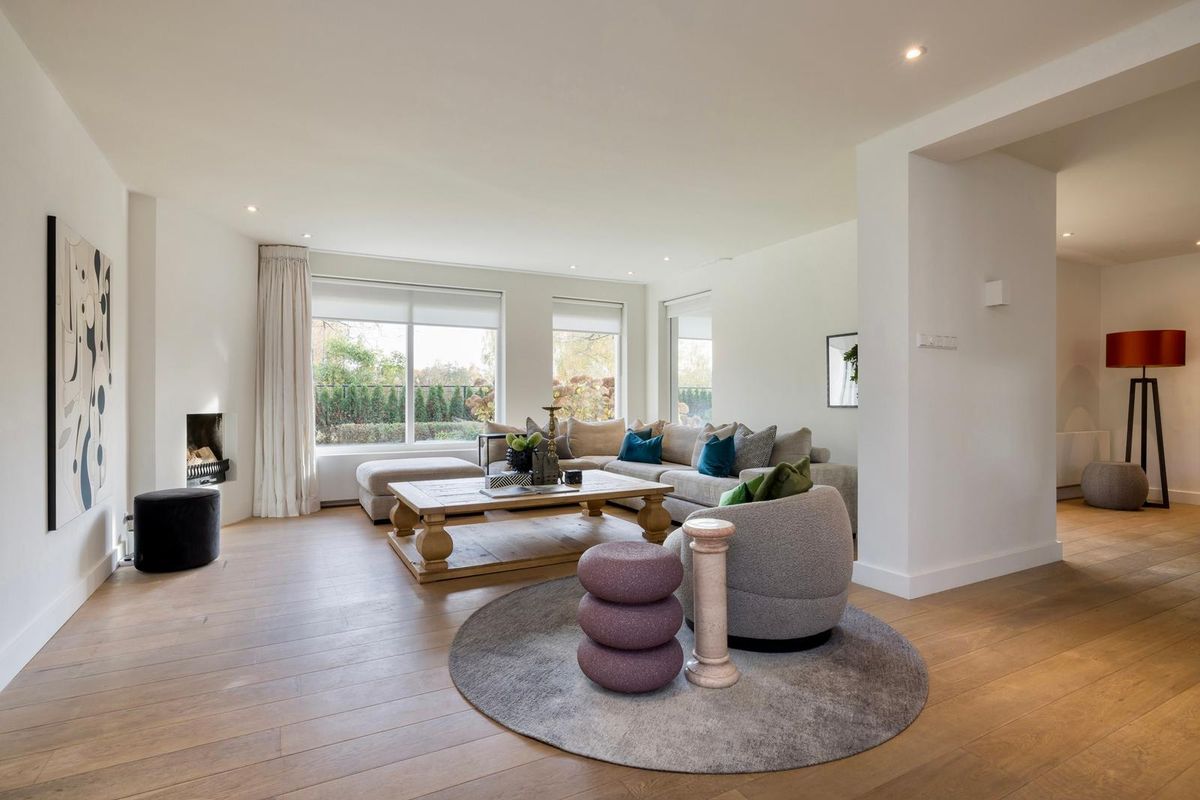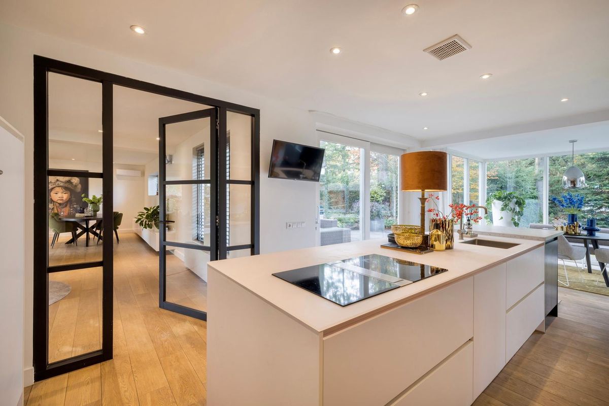 De living is riant opgezet en vormt het hart van de woning. Een stijlvolle tv-hoek met sierkachel, een royale eetruimte en een werkhoek aan de voorzijde zorgen samen voor een warme, uitnodigende sfeer. Vanuit de living loopt u door naar de prachtige leefkeuken met kook- en spoeleiland, voorzien van luxe inbouwapparatuur, royale kastruimte en een lichte serre die de ruimte verrijkt met daglicht en een prachtig uitzicht op de tuin.