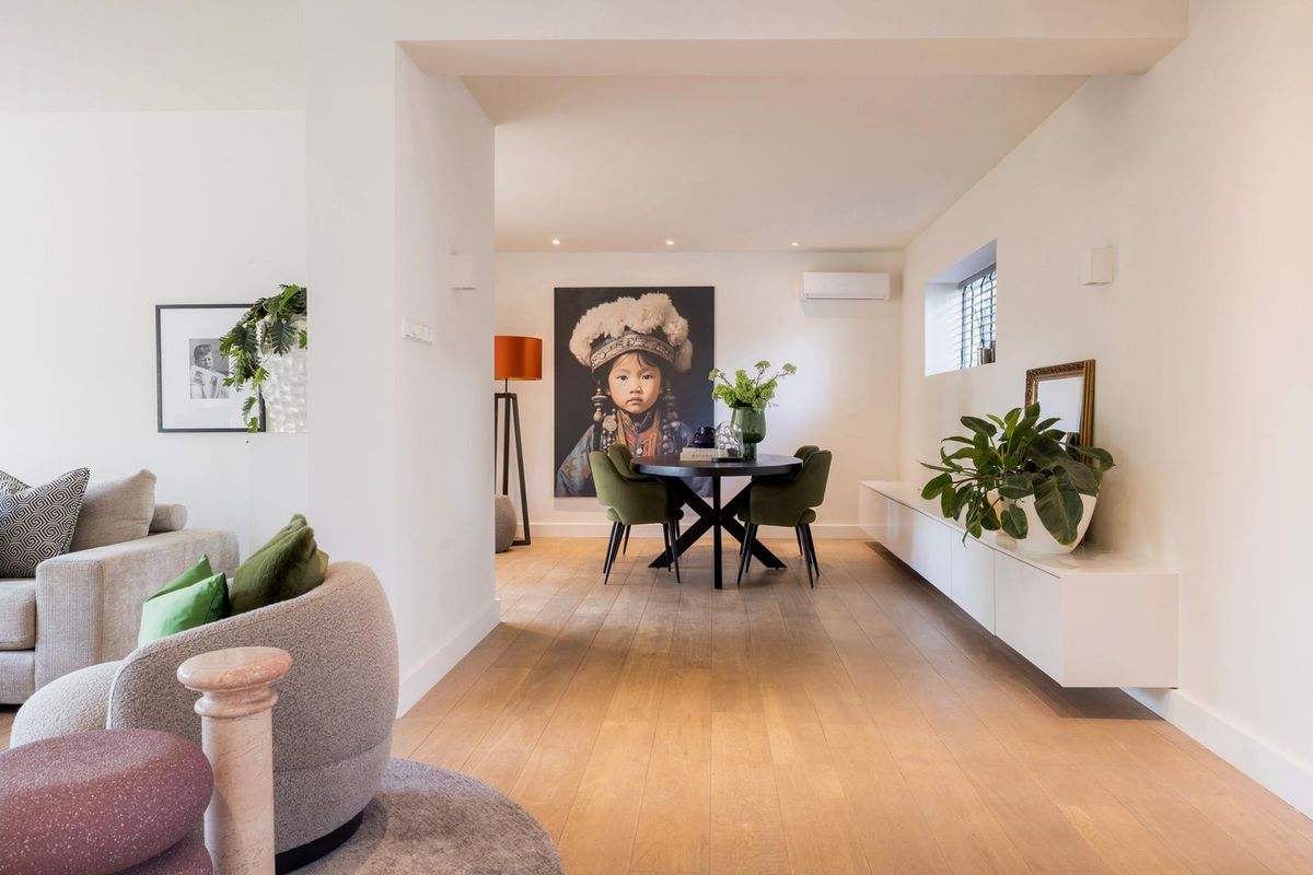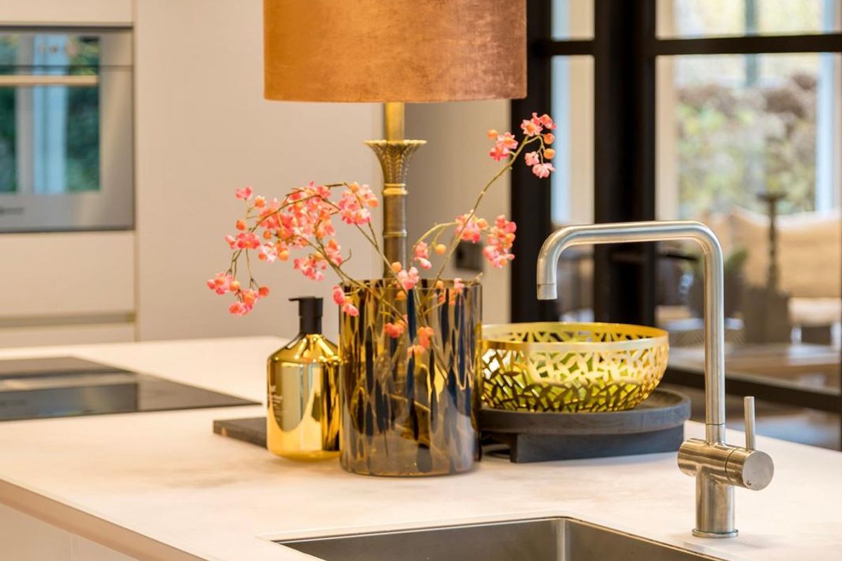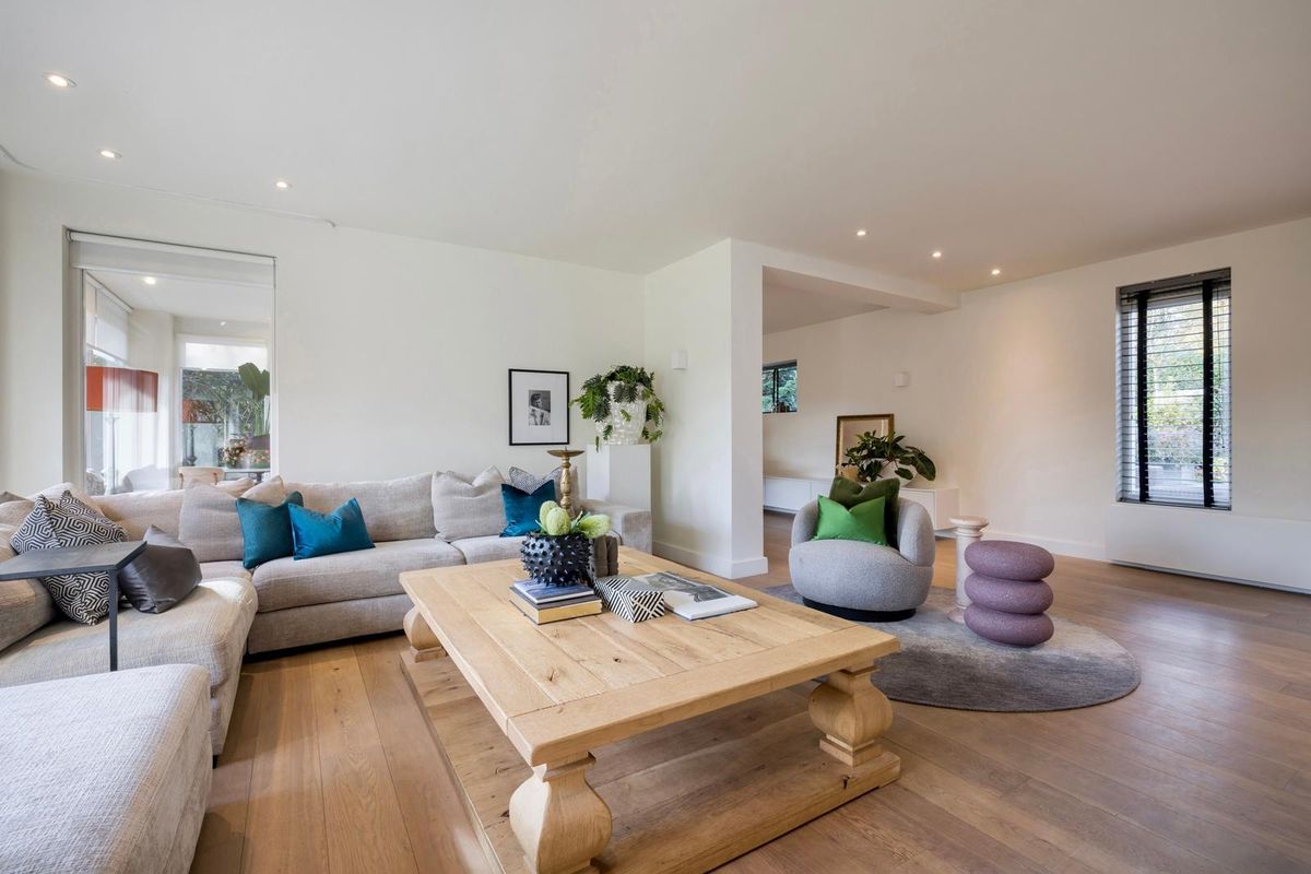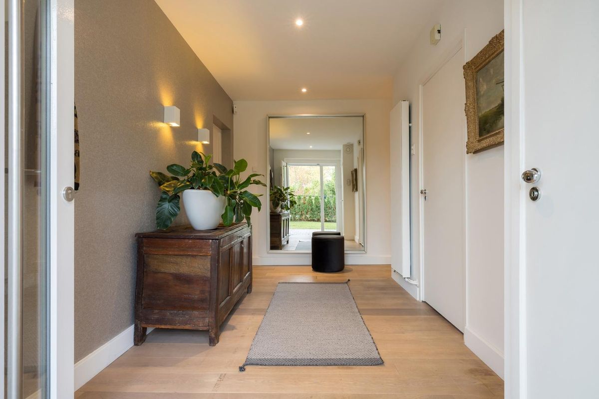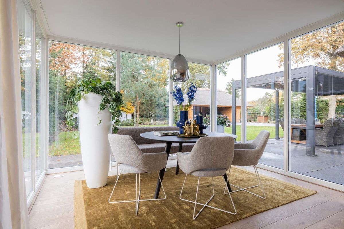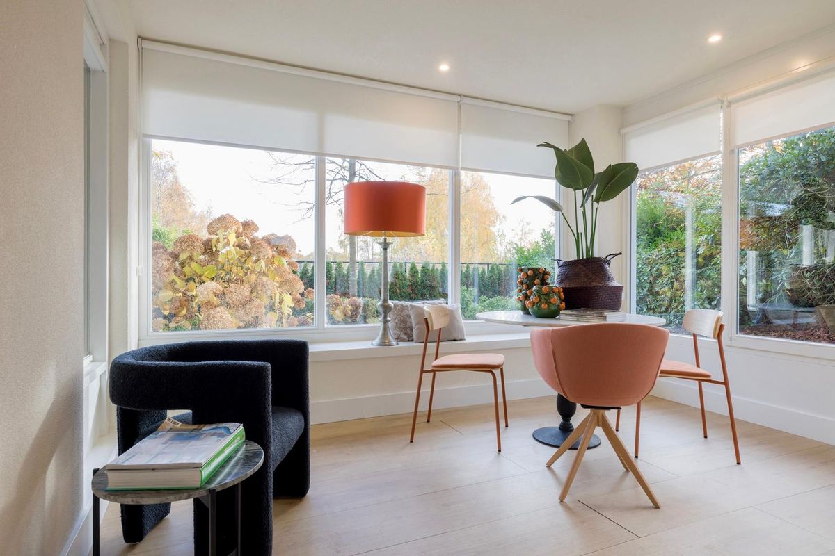 De living is riant opgezet en vormt het hart van de woning. Een stijlvolle tv-hoek met sierkachel, een royale eetruimte en een werkhoek aan de voorzijde zorgen samen voor een warme, uitnodigende sfeer. Vanuit de living loopt u door naar de prachtige leefkeuken met kook- en spoeleiland, voorzien van luxe inbouwapparatuur, royale kastruimte en een lichte serre die de ruimte verrijkt met daglicht en een prachtig uitzicht op de tuin.