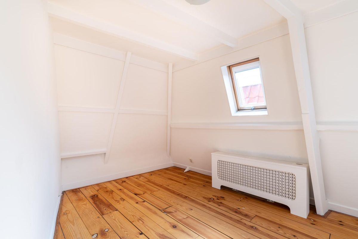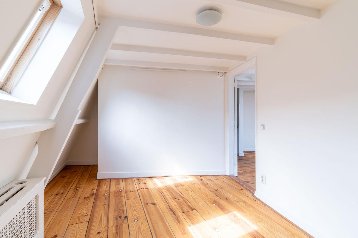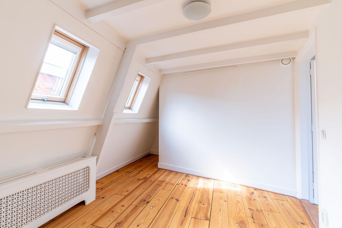 Entree op de eerste verdieping. Trap naar de 3e etage. Woonkamer met houten balken en prettige lichtinval en openstaande deur naar het balkon aan de voorzijde, open keuken, aparte slaapkamer aan de rustige achterzijde, badkamer met douche, wastafel en toilet.