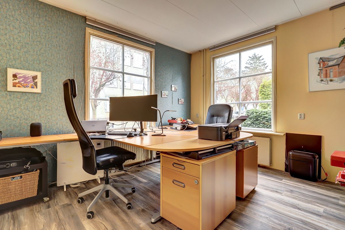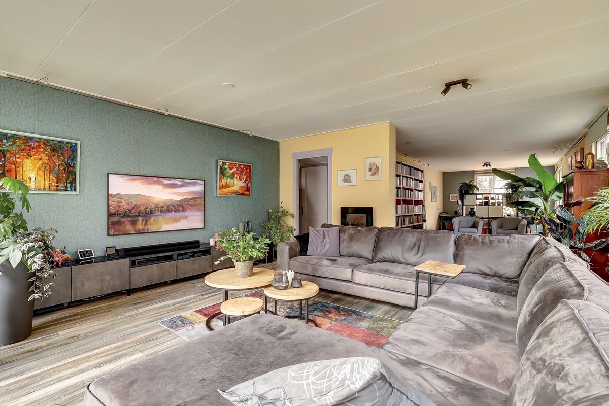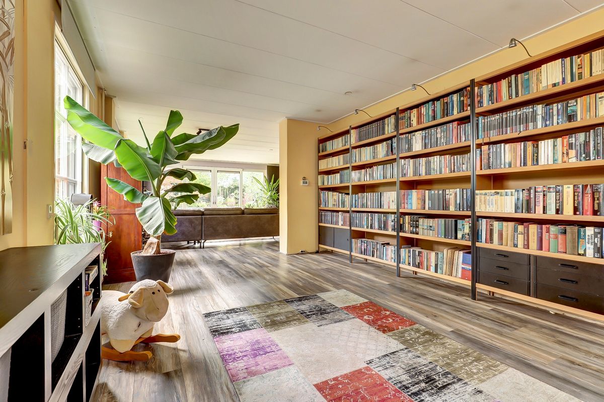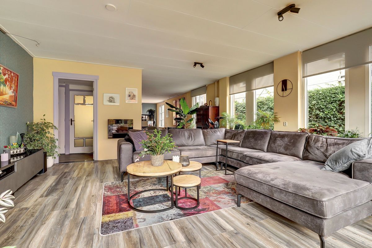 De woonkamer is aan de achterzijde uitgebouwd. Door de brede schuifpuien heb je ongehinderd zicht op de achtertuin. De woonkamer loopt helemaal door tot aan de de voorgevel van de woning. In dit deel van de woonkamer is d.m.v. een slimme inrichting een half afgesloten kantoor gecreëerd met een werkplek voor twee personen. Door de vele ramen in de zijgevel die aan de oprit grenst is het een zeer licht geheel.