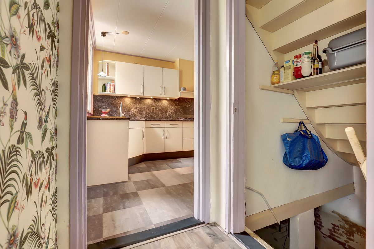 stijlvolle overdekte entree met originele voordeur. Achter de voordeur een lange gang. Onder de vloerbedekking ligt nog deels de originele granito vloer. In de hal is toegang tot de woonkamer en keuken en de trap naar boven. Ook is er een toilet met fonteintje. Voordat we de keuken inlopen komen we langs de deur naar de ruime en droge kelder. De gezellige keuken is in een hoekopstelling en heeft een groot raam naar de achter de keuken gelegen zeer grote bijkeuken met daklicht. De keuken is voorzien van diverse inbouwapparatuur en heeft een open verbinding met de royale en gezellige eetkamer aan de voorzijde van de woning.