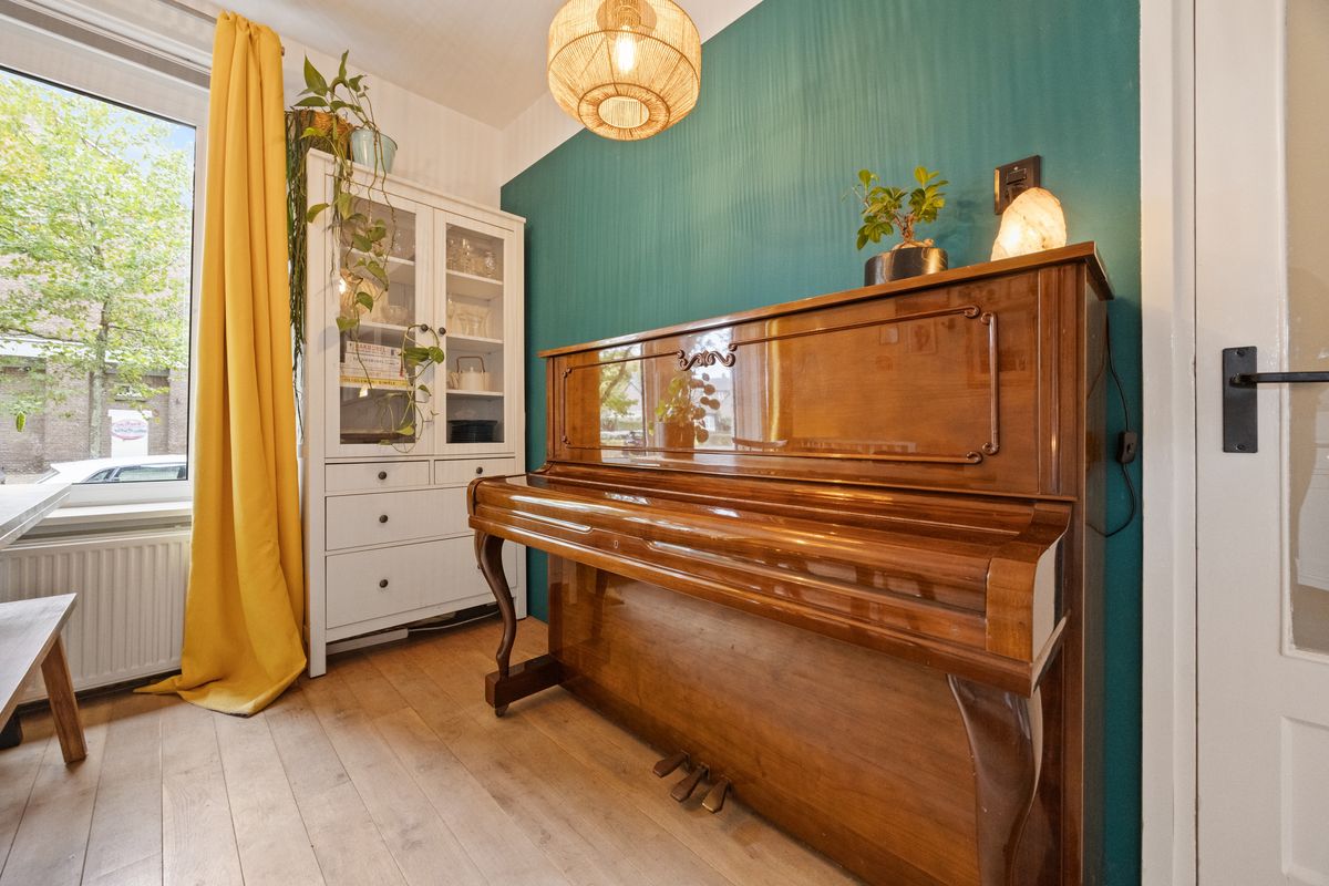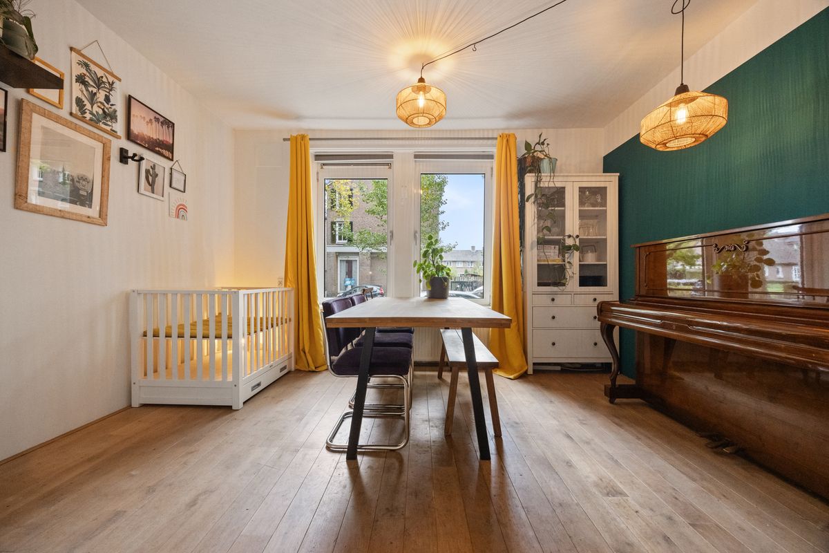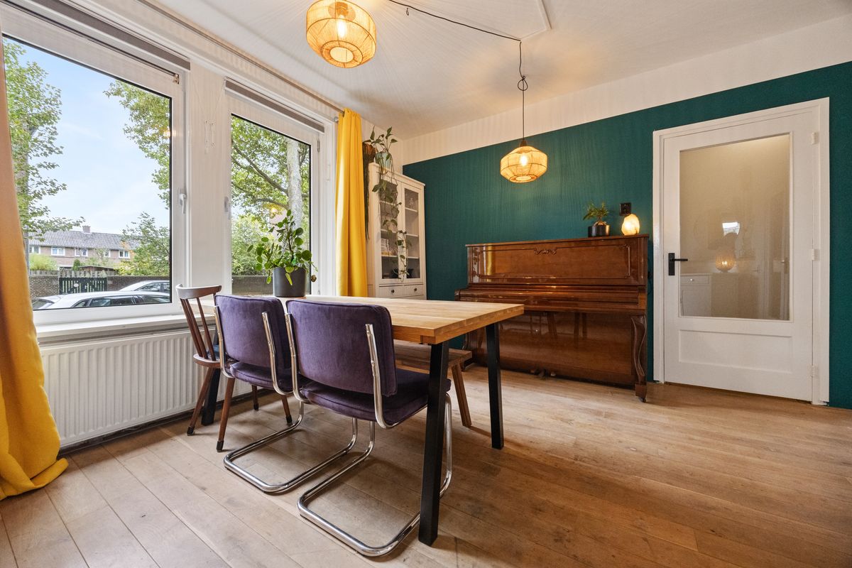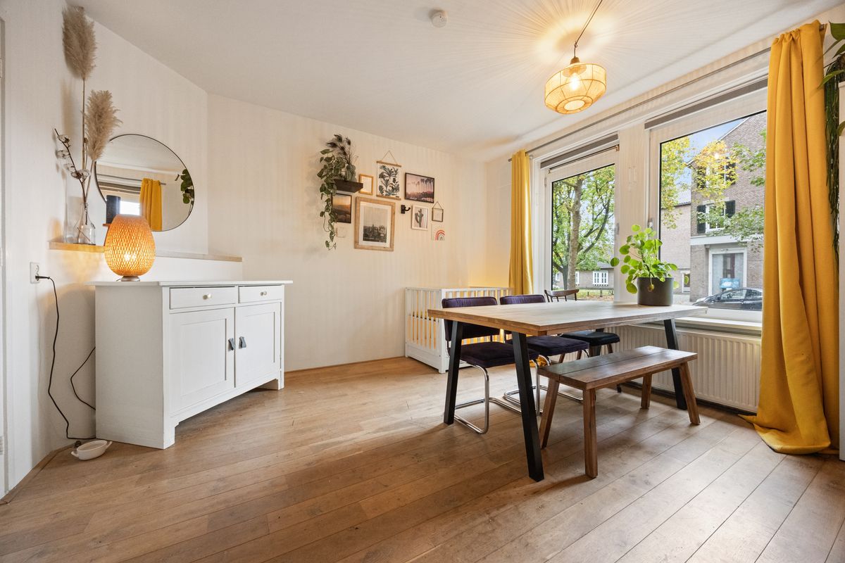 Aan de rechterzijde van de entree vind je de ruime doorzonwoonkamer, die zich uitstrekt van de voorzijde tot de achterzijde van de woning. Het eetgedeelte ligt aan de voorzijde, waar je gemakkelijk een grote eettafel met 4 tot 6 stoelen kunt plaatsen. De achterzijde is ingericht als zitgedeelte met ruimte voor een comfortabele bank en tv-opstelling. Dankzij de grote raampartijen geniet je hier de hele dag van veel natuurlijk licht.