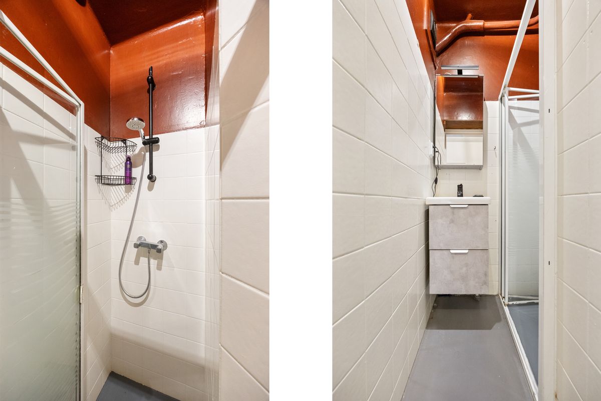 De slaapkamer ligt aan de rustige zijde van de woning en biedt voldoende ruimte voor een tweepersoonsbed en kledingkast. De badkamer is praktisch ingericht met een douchecabine en een wastafel met meubel.