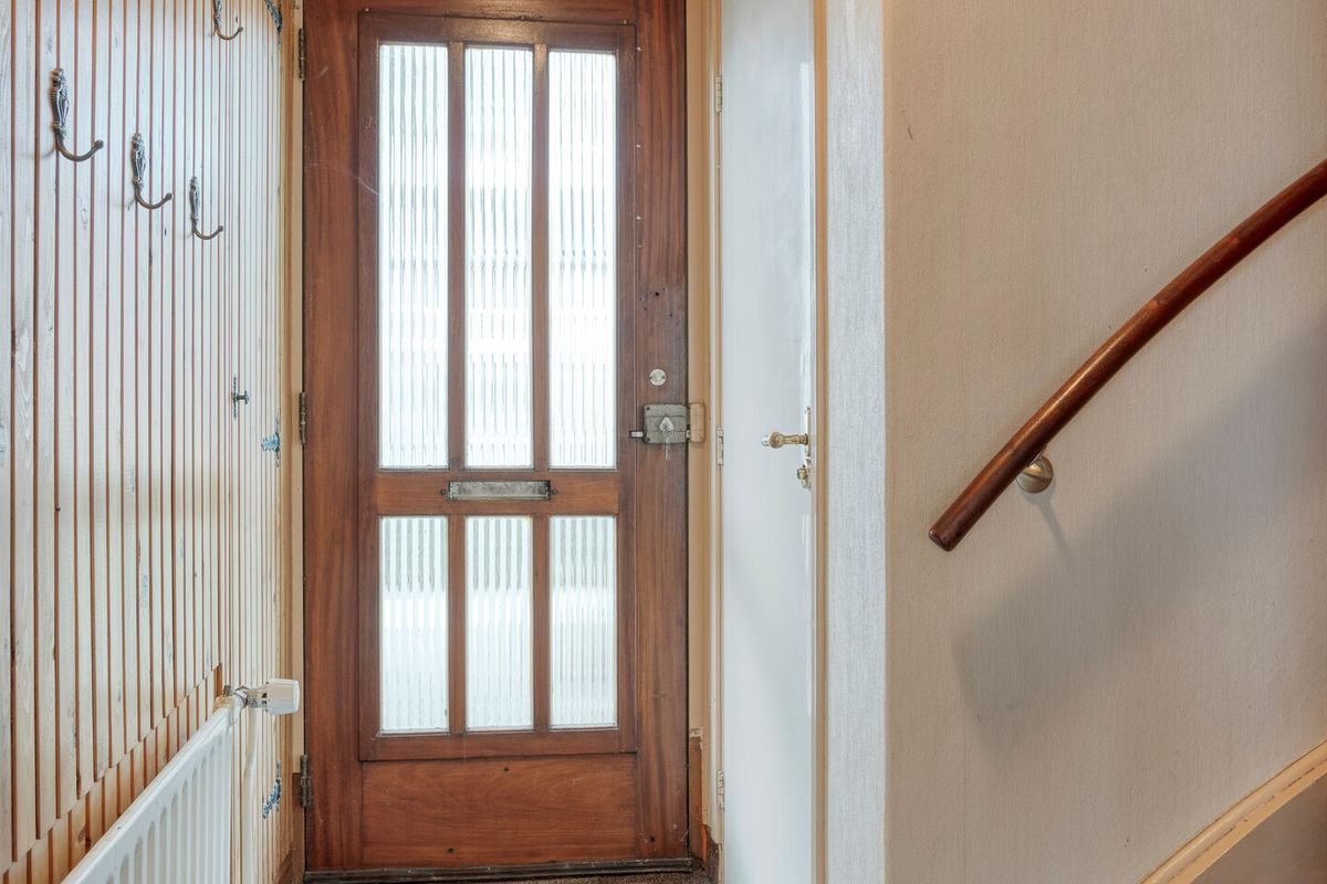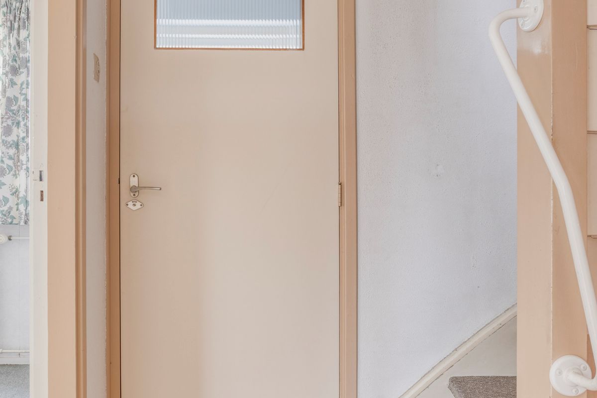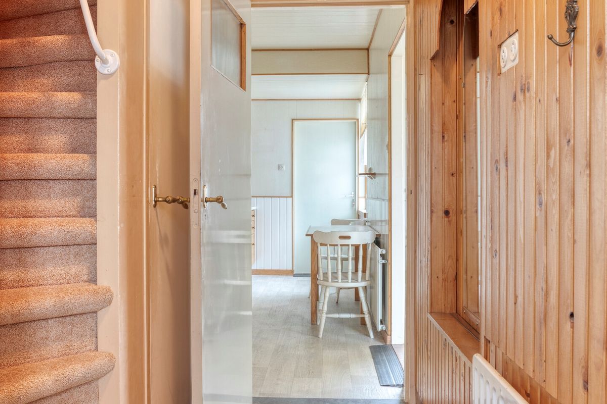 Entree/hal met lambrisering, meterkast, trapopgang en toilet. Vanuit de hal is er toegang tot de gesloten keuken met wandopstelling. De keuken geeft doorgang naar de woonkamer en naar een ruime bijkeuken met witgoedaansluitingen. De doorzonwoonkamer heeft de karakteristieke grote raampartijen uit de jaren ’60 en een extra raam in de zijgevel, waardoor er veel licht binnenkomt. De praktische bijkeuken is ideaal voor het opbergen van voorraad, huishoudelijke apparatuur of andere spullen. Van hieruit is er toegang tot het beschutte terras op het zuiden, een fijne plek om van de zon te genieten.