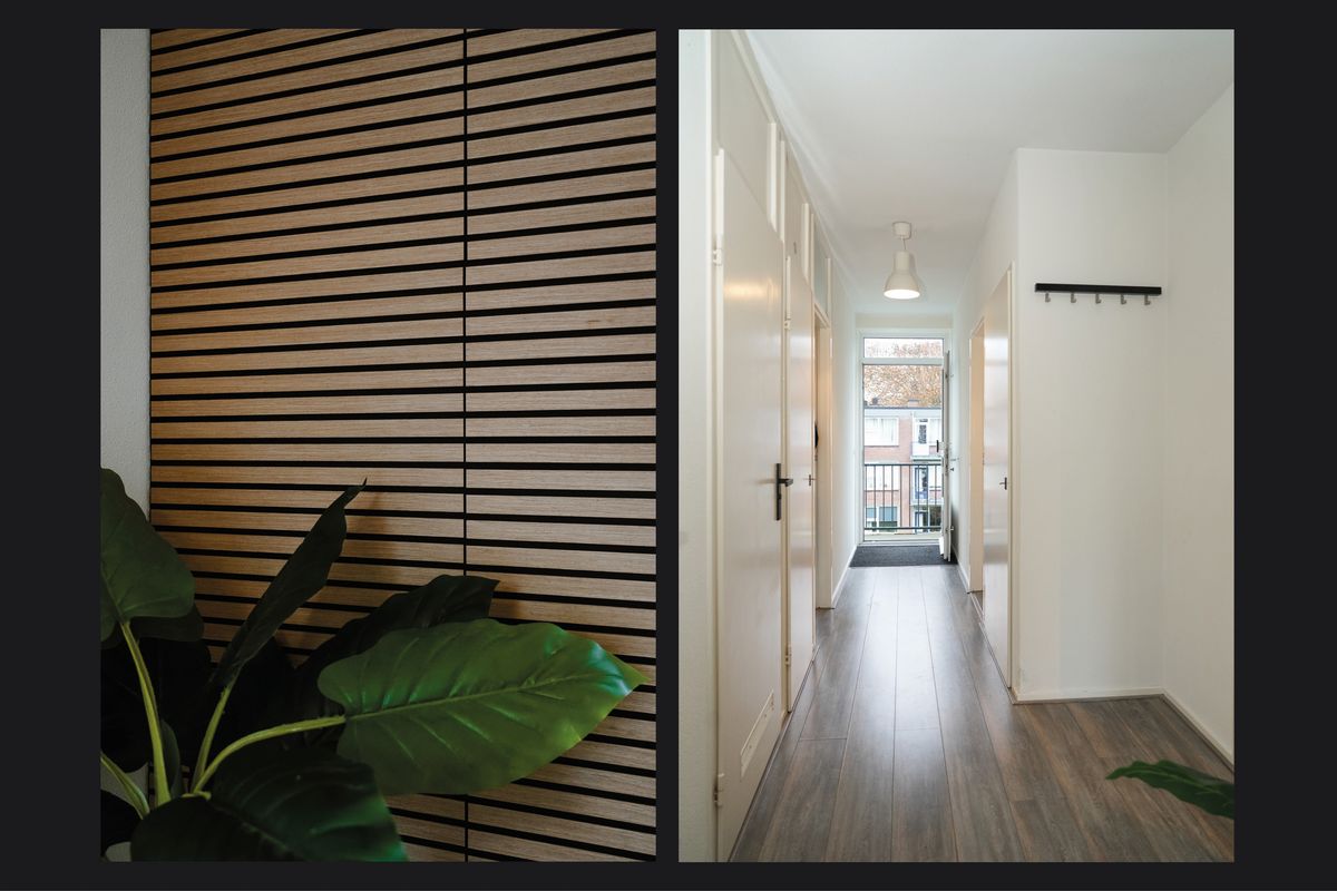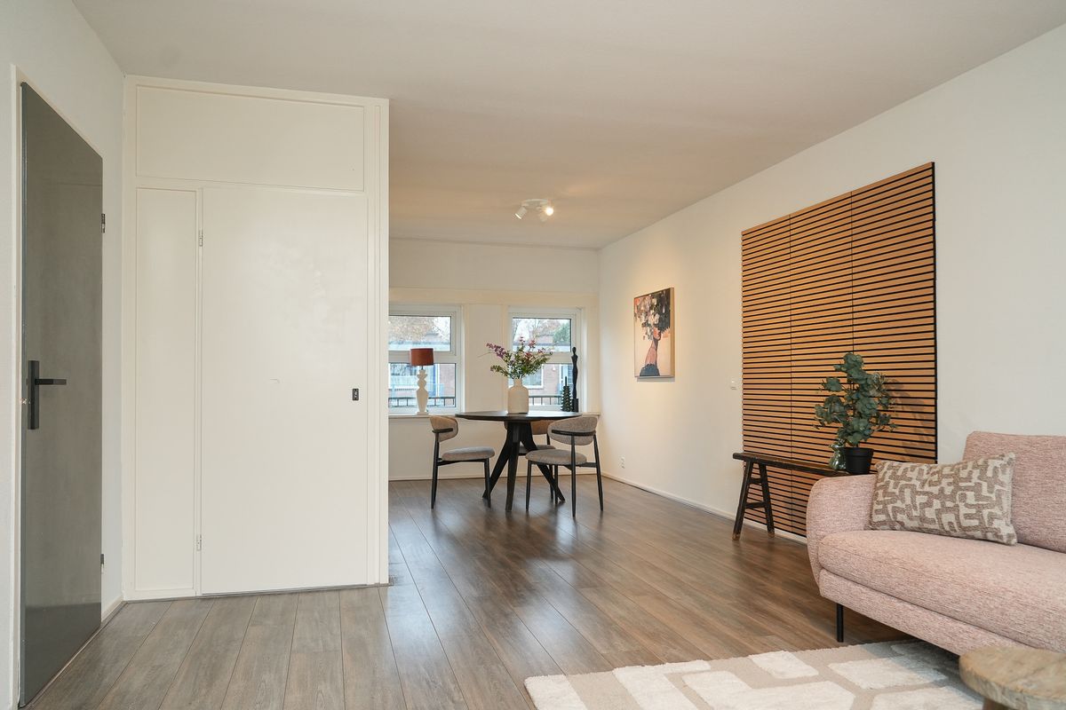 Woonverdieping: Via een entree biedt de hal toegang tot alle vertrekken, te weten de woonkamer, de keuken, twee slaapkamers, een nette toiletruimte en een verzorgde badkamer. De ruime woonkamer over de gehele diepte van het appartement beschikt over grote raampartijen in de voor- en achtergevel. Middels een kleine ingreep is hier eenvoudig een derde slaapkamer te creëren. Verder heeft de woonkamer een balkon op het zuiden met ruimte voor een zitje. De nette keuken is voorzien van inbouwapparatuur. De twee slaapkamers beschikken allebei over een ruime inbouwkast. De woonkamer, hal en slaapkamers zijn voorzien van een laminaatvloer met houtlook.