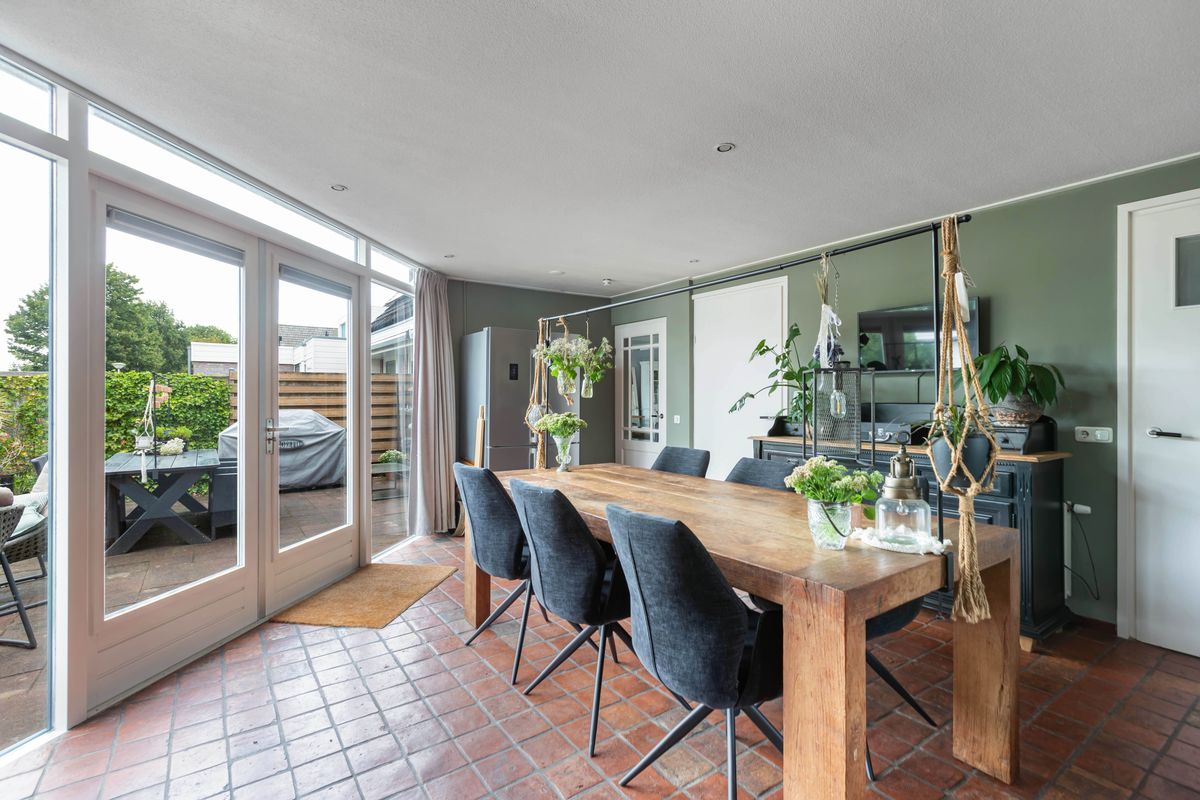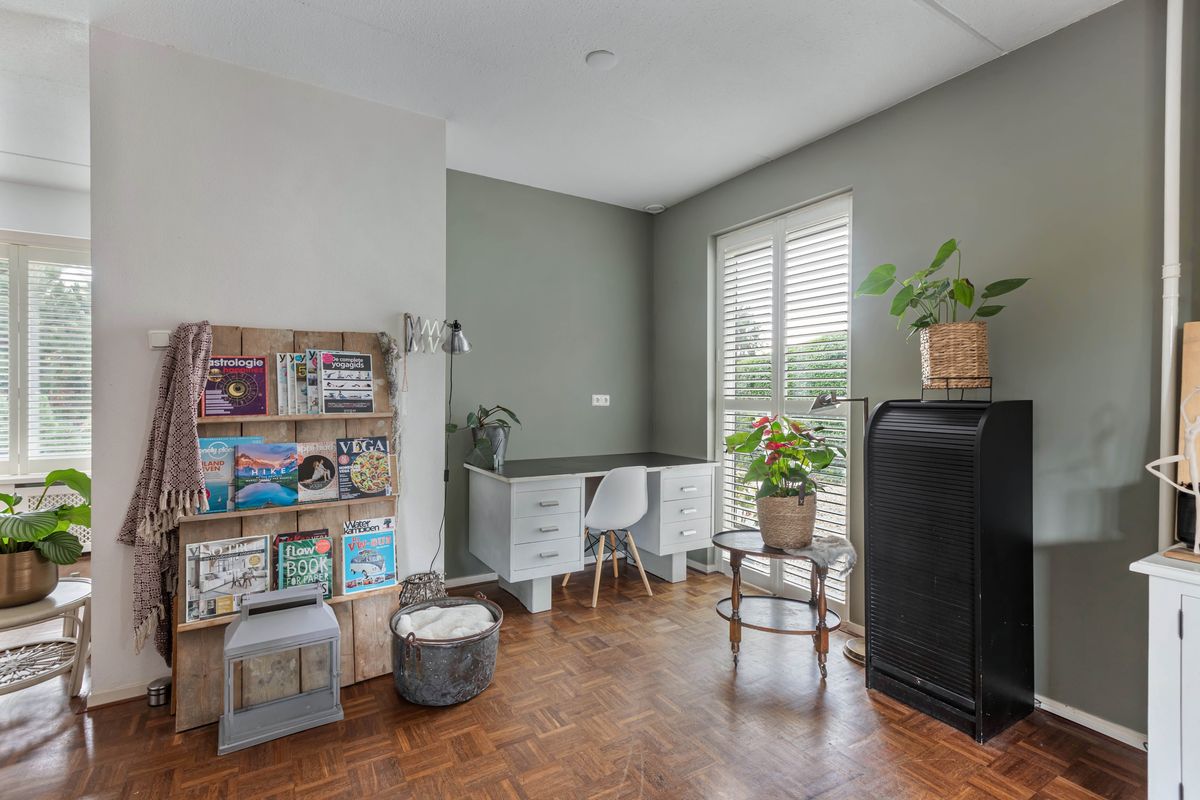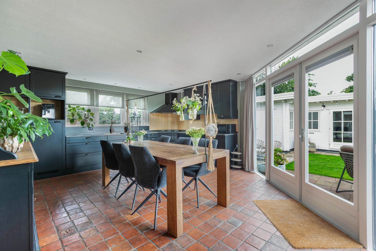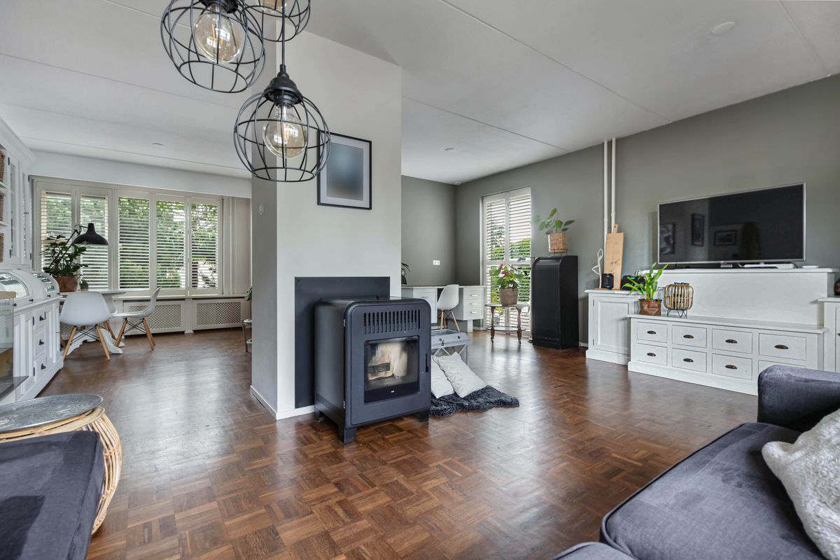 De woning zelf verrast met ruimte en mogelijkheden. Dankzij de royale uitbouw vind je op de begane grond een sfeervolle woonkamer met haard in het midden en een schuifpui naar de tuin, een grote woonkeuken van ruim 25 m² en bovendien een slaapkamer met en suite badkamer en een praktische bijkeuken. Daarmee is de woning niet alleen levensloopbestendig, maar ook perfect geschikt voor een praktijk of kantoor aan huis.