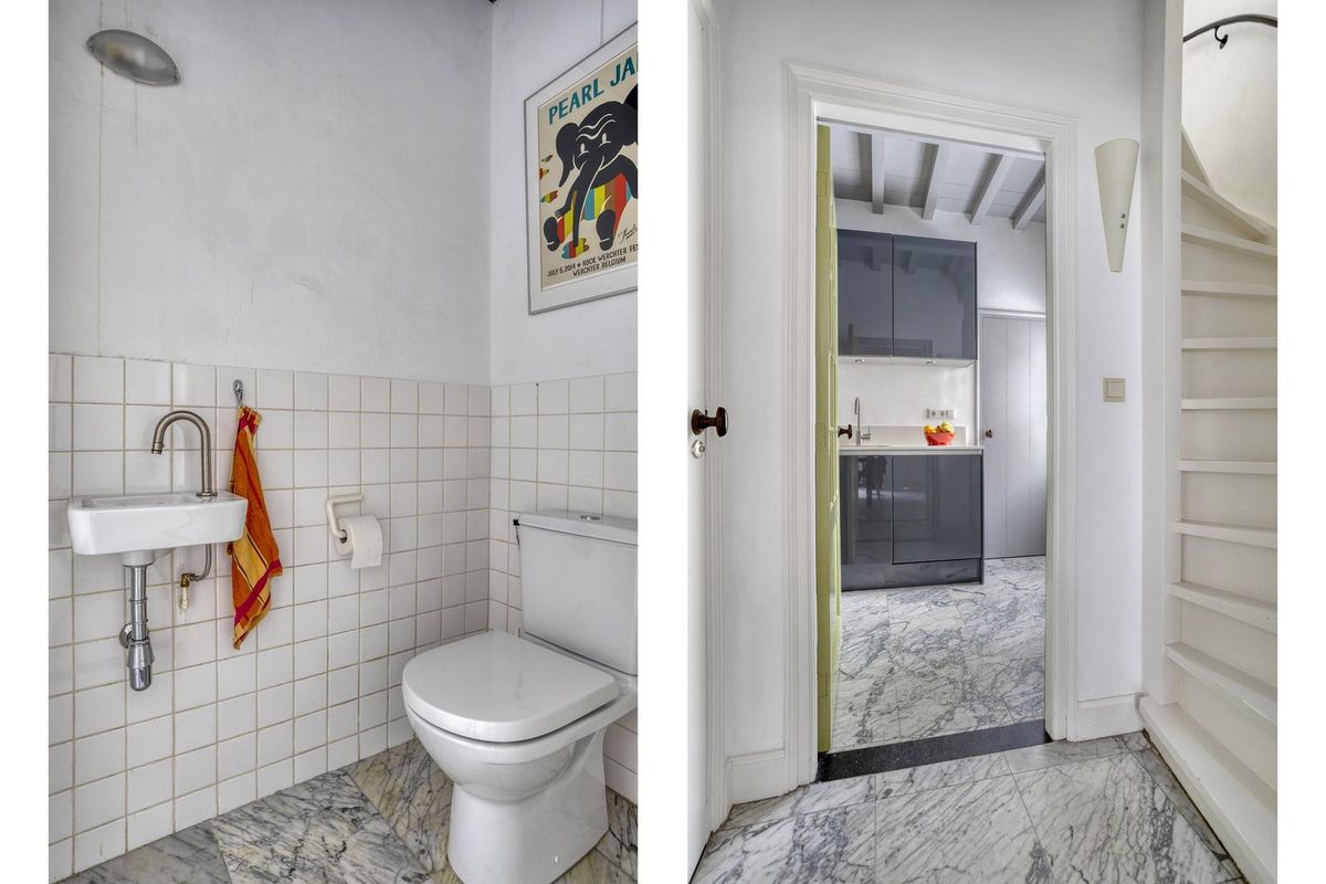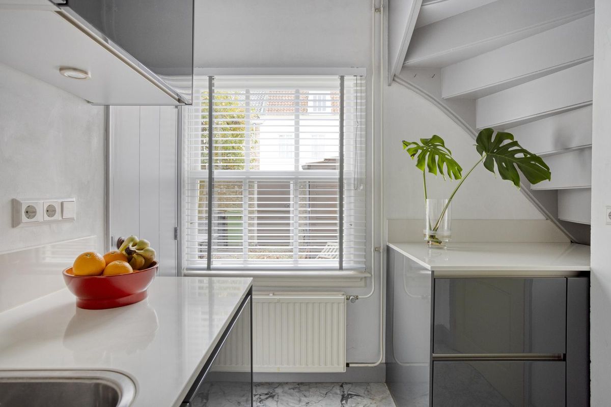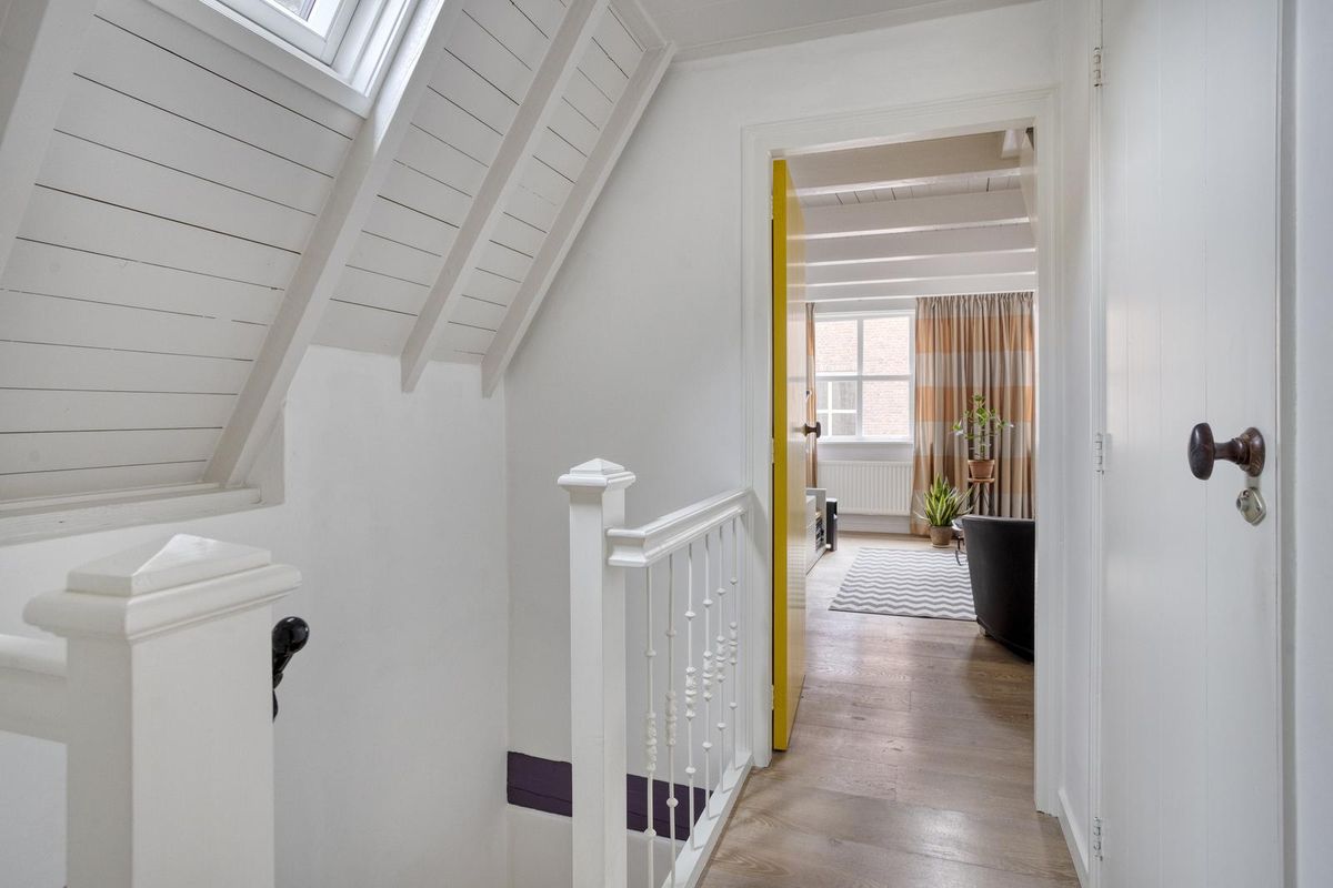 De woonkamer bevindt zich op de eerste verdieping. Zodra je boven komt, voel je het: dit is een kamer met sfeer. Dankzij de vide kijk je helemaal tot in de nok, waardoor de ruimte groter en lichter aanvoelt dan je verwacht van dit kleine huis. Het originele dakbeschot is zichtbaar en geeft de ruimte een ruime uitstraling. De hoge plafonds, de lichtinval en de charmante indeling maken dit een heerlijke plek om te ontspannen. Vanuit hier heb je via een trap toegang tot de zolder, een praktische ruimte perfect voor extra opslag.