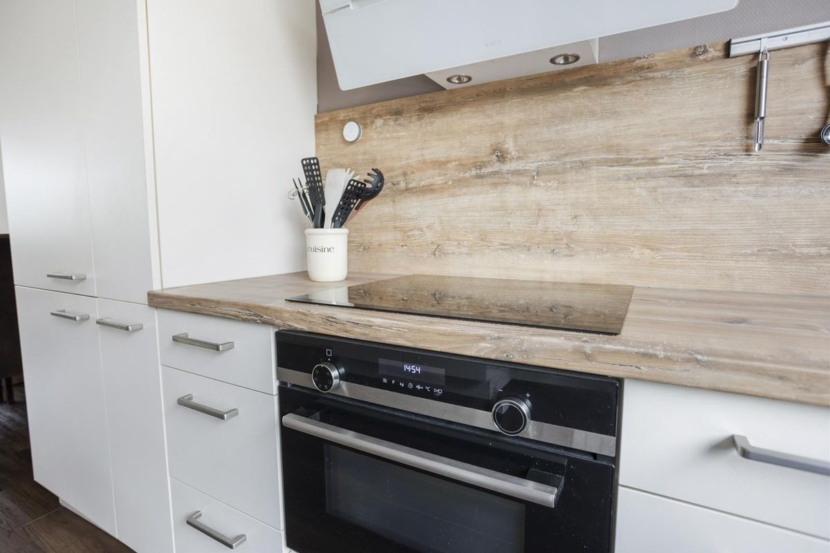 De L-vormige keuken is recentelijk geplaatst en voorzien van diverse inbouwapparatuur.