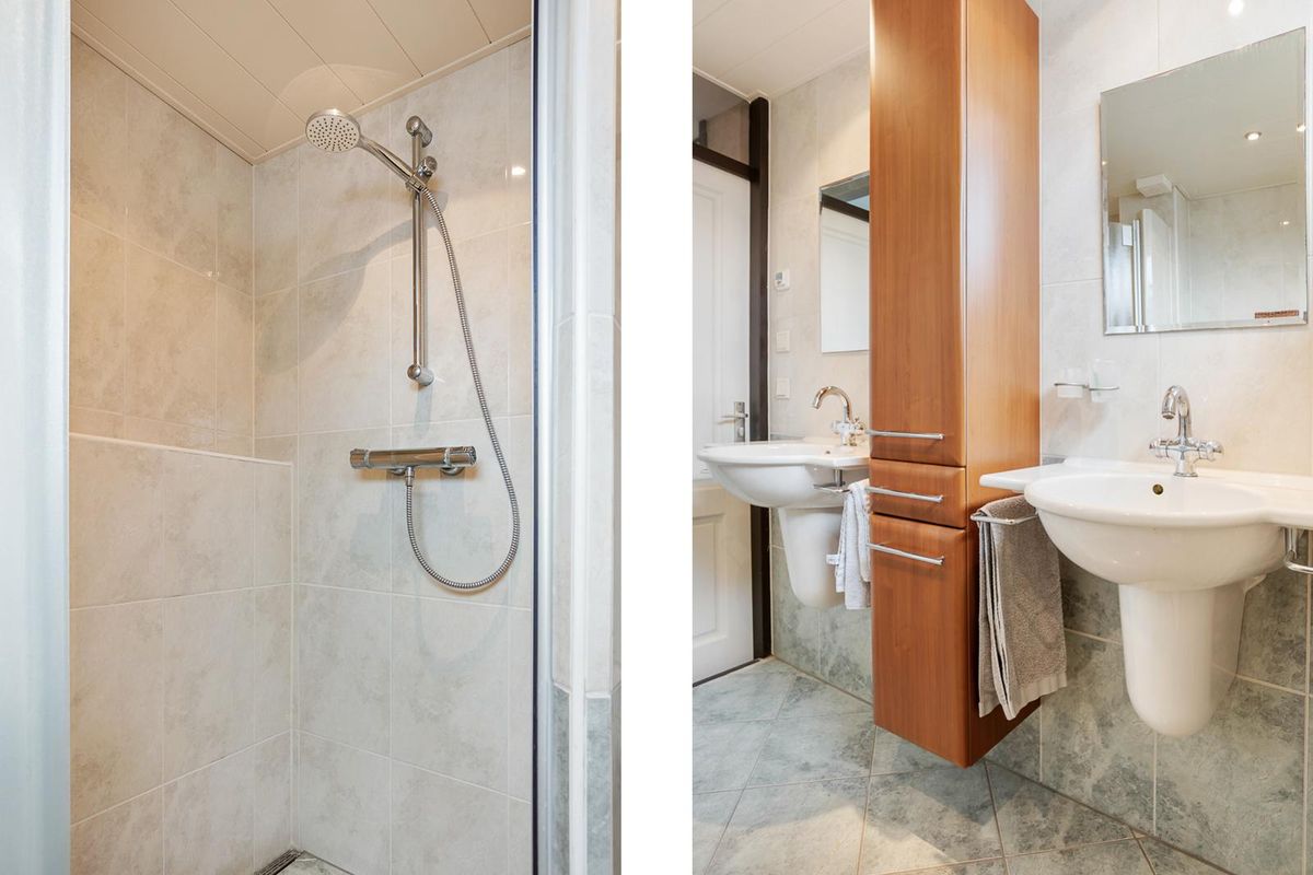 De badkamer is modern en licht uitgevoerd, met een douche, dubbele wastafel met meubel en zwevend toilet.