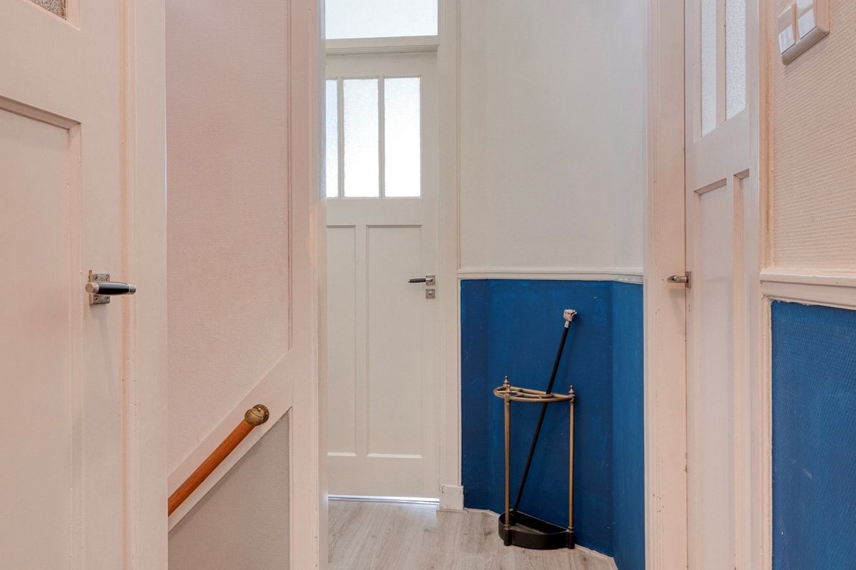 Open portiek naar 1e verdieping, entree woning/tochtportaal met bergruimte en groepenkast. Trap naar woonverdieping, centrale gang met toegang tot alle ruimtes.