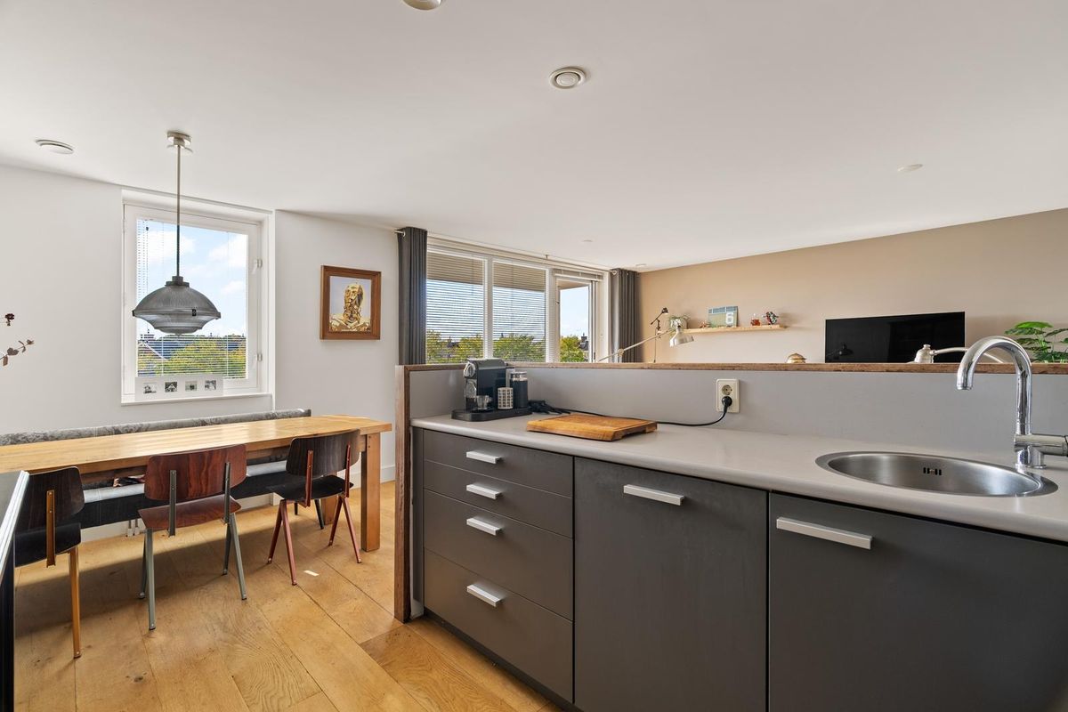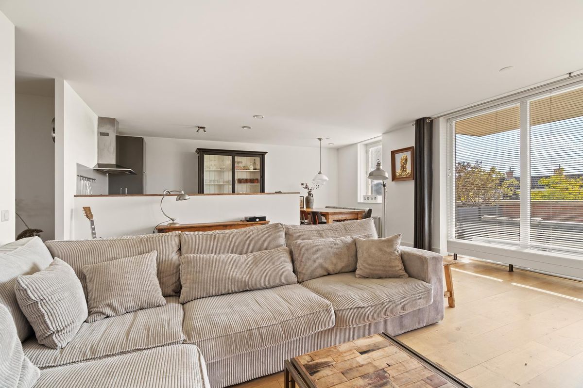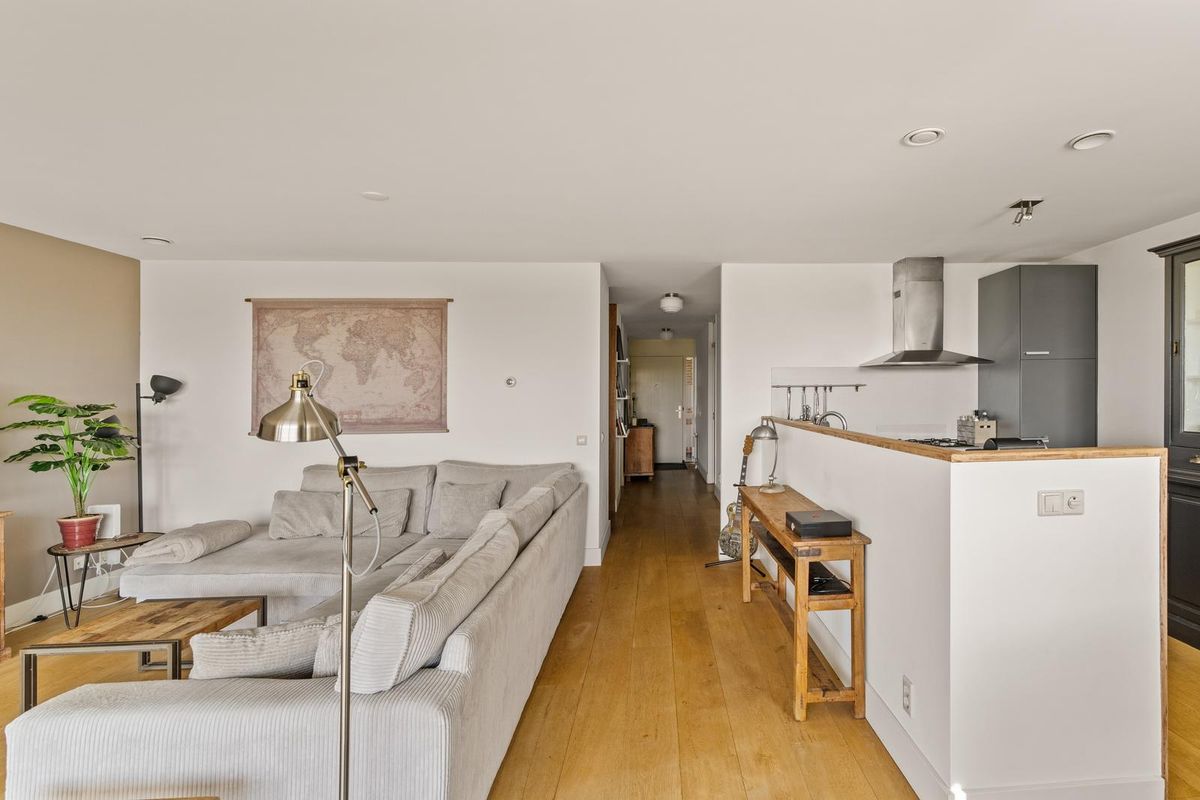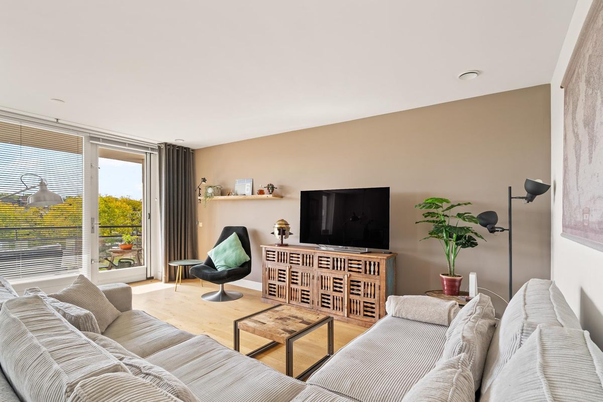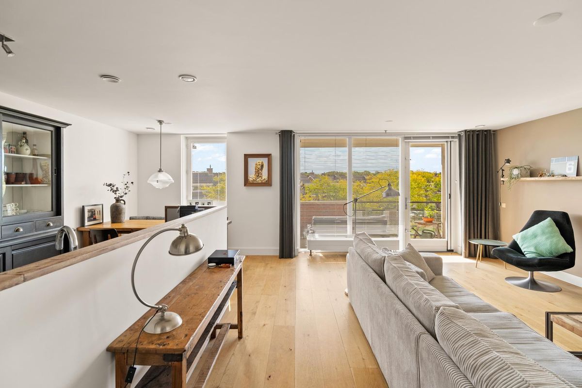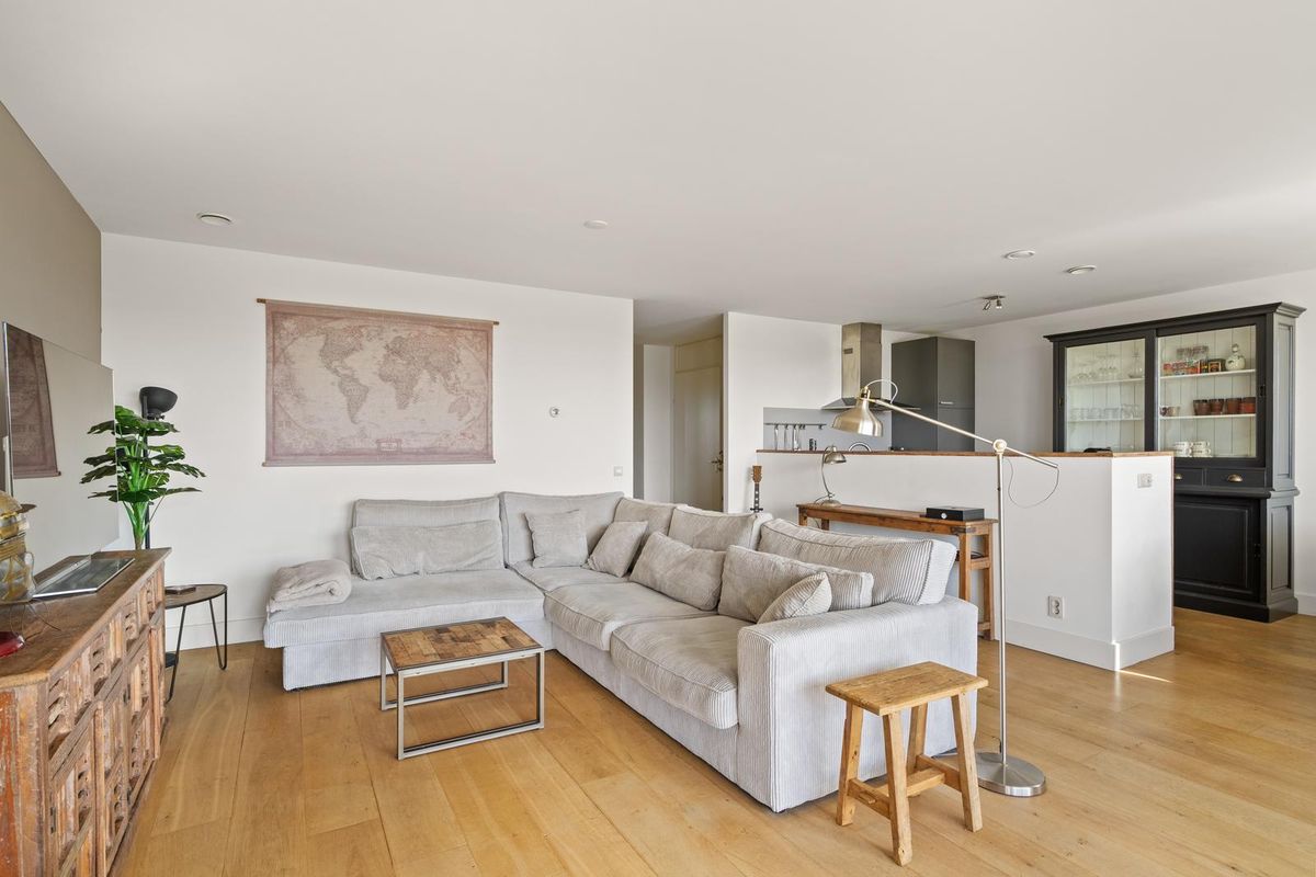 De royale woonkamer met grote raampartijen biedt veel natuurlijk lichtinval en heeft glad gestucte wanden en plafonds. Vanuit de woonkamer heeft u direct toegang tot het zonnige balkon op het zuidwesten, een fijne plek om van de middag- en avondzon te genieten.