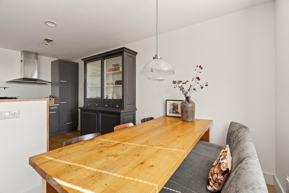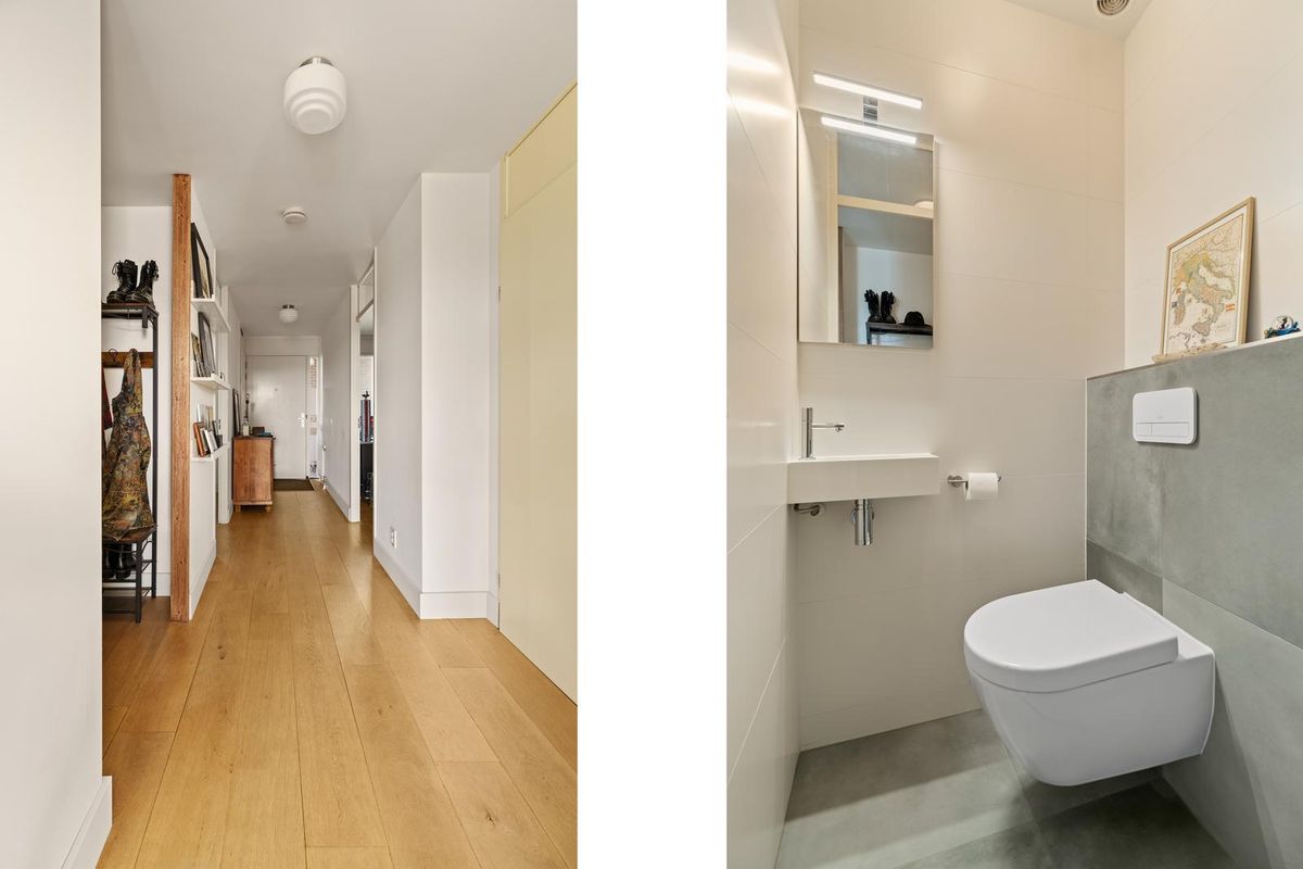 U komt binnen in een ruime hal met toegang tot de meterkast, een netjes afgewerkte toiletruimte met fonteintje en de verschillende vertrekken. De houten vloer loopt mooi door in vrijwel het hele appartement en zorgt voor een warme, verzorgde uitstraling.
