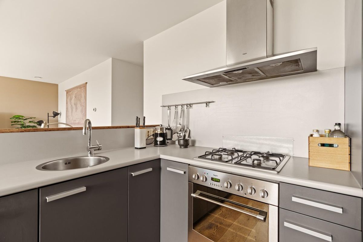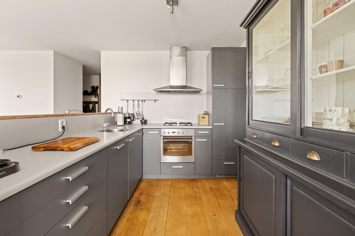 De open keuken in L-opstelling sluit aan op de woonkamer en is voorzien van diverse inbouwapparatuur, waaronder een 4-pits gaskookplaat, rvs afzuigkap, vaatwasser en een koel-/vriescombinatie (vernieuwd in 2024). De keuken is praktisch ingericht en netjes onderhouden.
