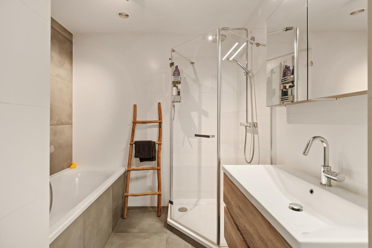De badkamer (uit 2016) is modern afgewerkt en voorzien van een ligbad, aparte douche, wastafelmeubel met spiegel en verlichting, en een designradiator.