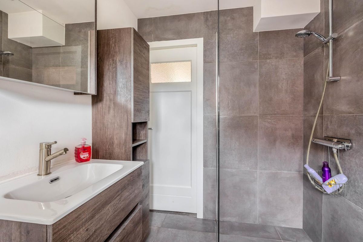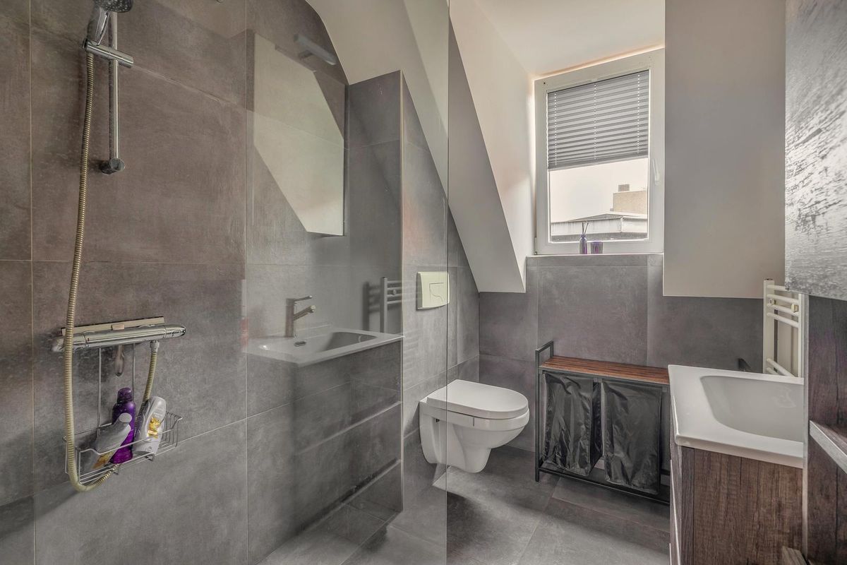 In de badkamer (ca. 4,5m²) zijn een inloopdouche, wastafelmeubel en toilet aanwezig. Ook hier zorgt de dakkapel voor extra ruimte en lichtinval.