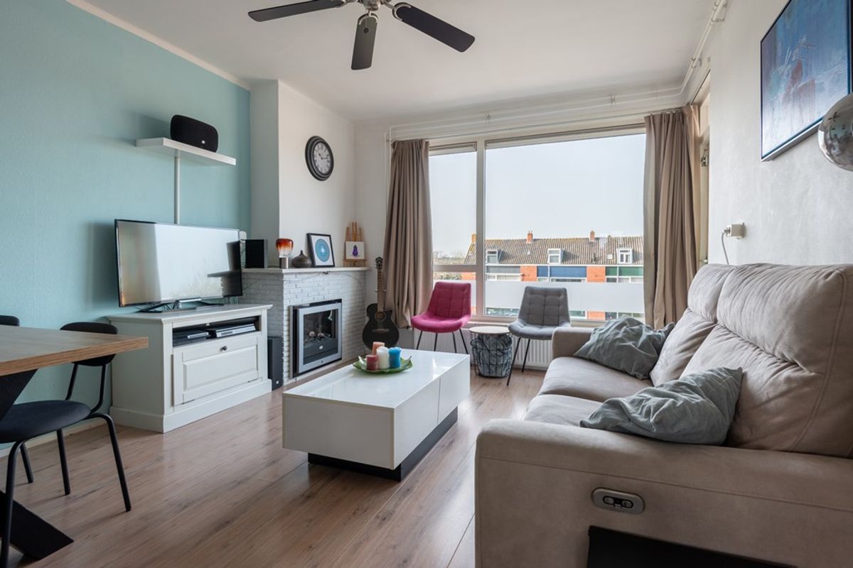 De woonkamer is lekker licht, met name door de kamerbrede in kunststof uitgevoerde raampartij en de laminaat vloer in een neutrale kleurstelling. De wanden zijn netjes gesausd en het plafond is glad gestuukt, de woonkamer is verder nog voorzien van een schouw met mogelijkheid voor een open haard (door de huidige eigenaar sinds 2021 niet gebruikt). Via een enkele openslaande deur is het inpandige balkon te bereiken.