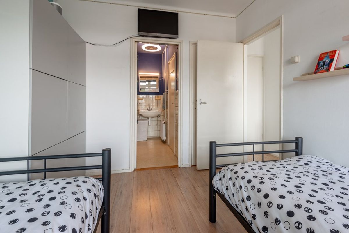 Vanuit de woonkamer is de slaapkamer van ca. 10m2 te bereiken. Ook deze kamer is netjes en voorzien van dezelfde laminaat vloer. Televisie kijken in bed? Het kan, de aansluiting is er. De slaapkamer geeft via openslaande deuren toegang tot het balkon en voor ventilatie zijn er tevens openslaande raampjes boven de terrasdeuren.