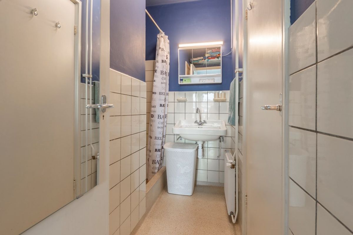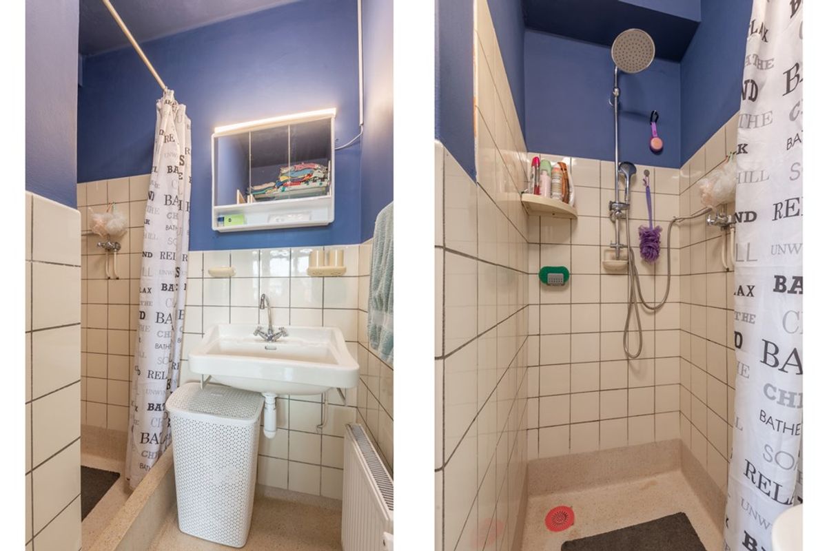 De badkamer is vanuit de gang bereikbaar maar ook rechtstreeks uit de slaapkamer. De sanitaire ruimte is eenvoudig maar netjes met de originele granito vloer. Opgesplitst in een separate toiletruimte en doucheruimte met een vaste wastafel en verwarming.