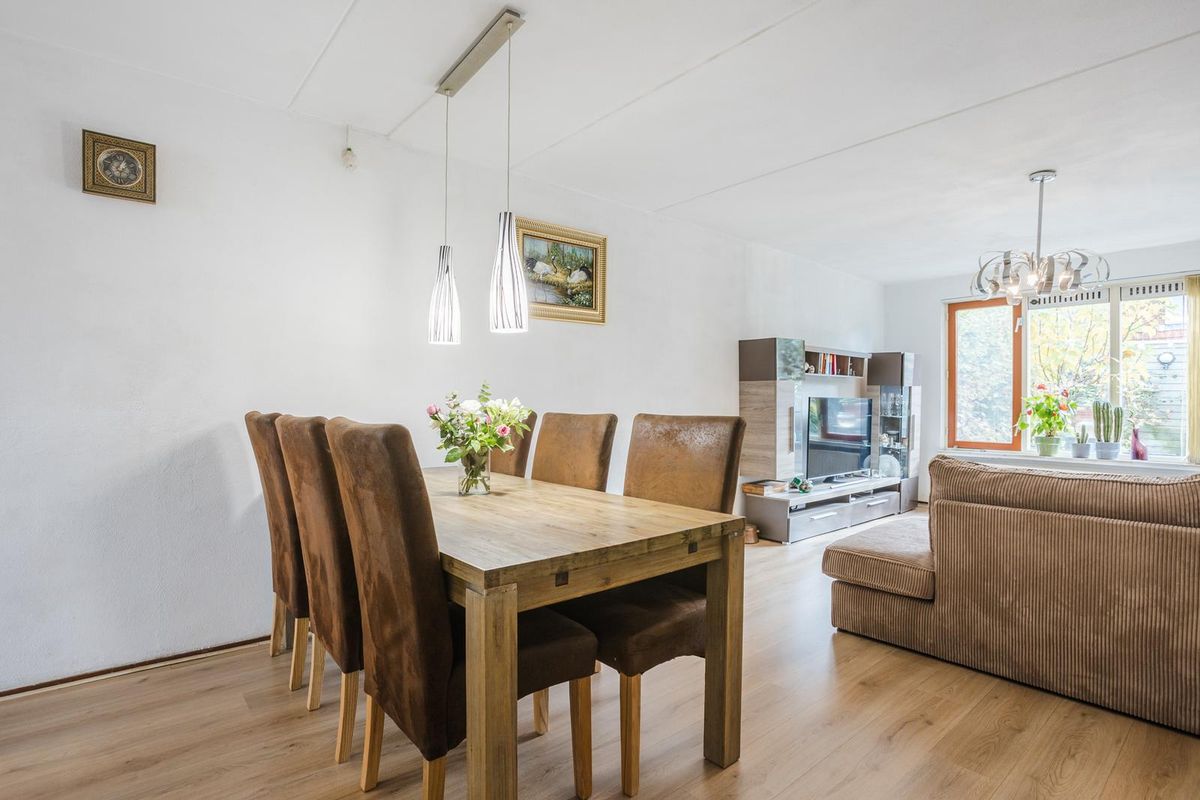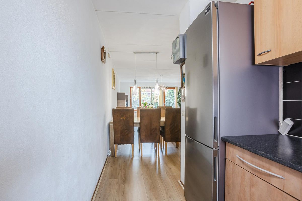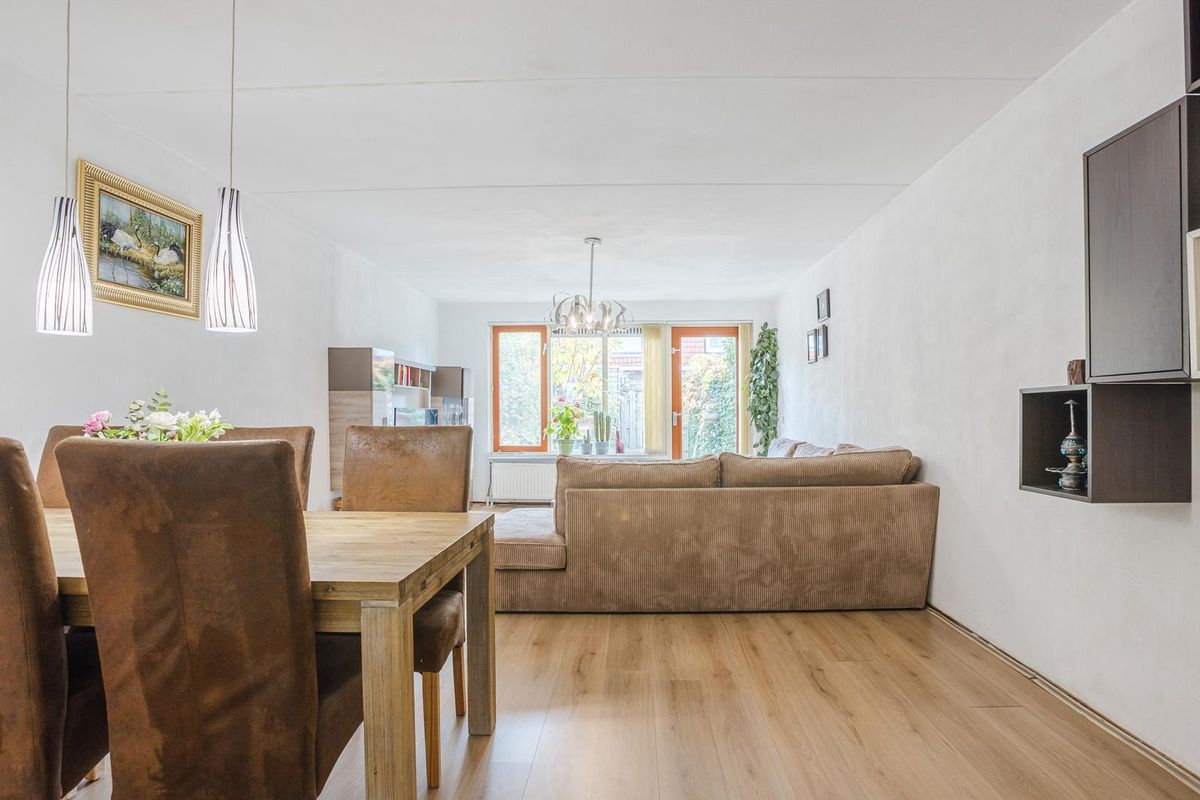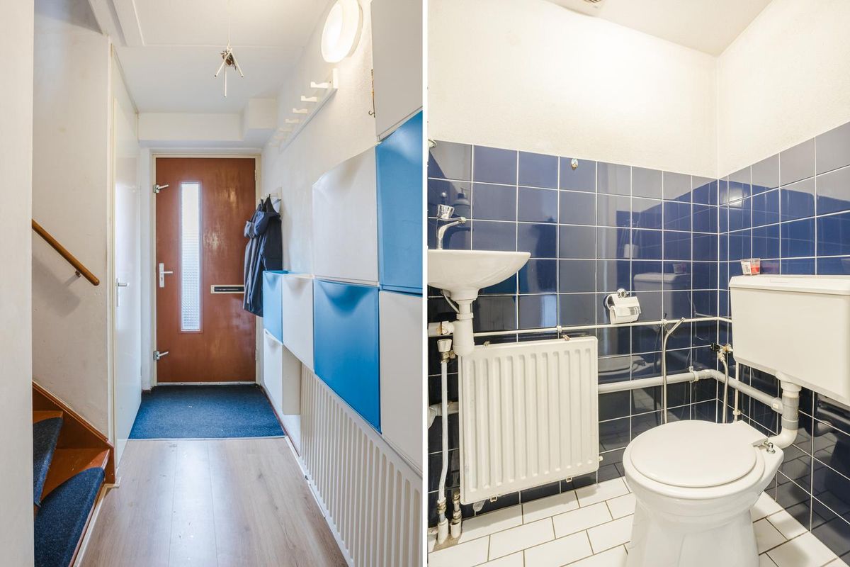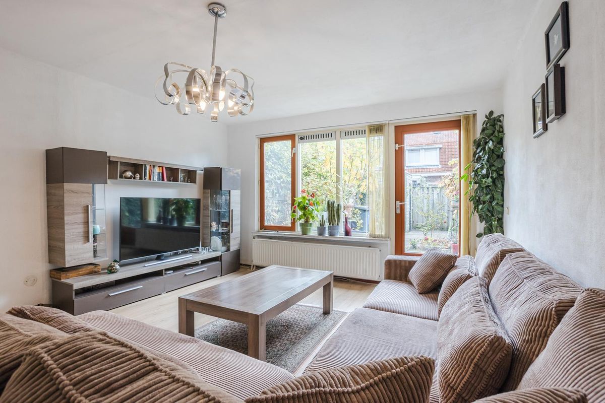 Via de hal met toilet en trapopgang komt u in de lichte, tuingerichte woonkamer met openslaande deuren naar de achtertuin. Binnen en buiten lopen hier mooi in elkaar over. Onder de trap bevindt zich een praktische bergkast.