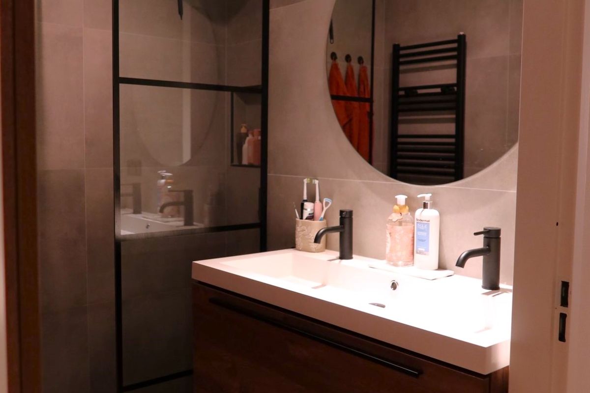 Step into the sleekly finished living room. Thanks to the modern decor—think contemporary furniture, beautiful materials, subtle colors, and plenty of light—you'll immediately feel at ease. The semi-open kitchen is truly stunning: luxurious, fully equipped, and with all the necessary built-in appliances. The bathroom is just as stylish: beautifully tiled, featuring a spacious shower and a modern vanity. Shower in style here!