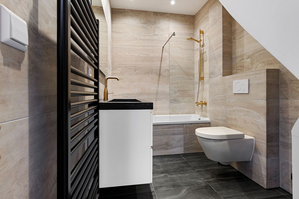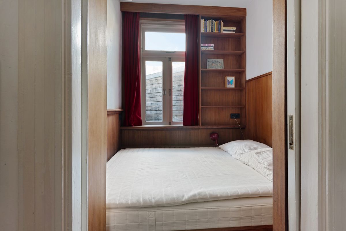 De badkamer is voorzien van een ligbad en toilet. Een sfeervolle glas-in-lood en-suite scheidt de voor- en woonkamer van elkaar. Aan de achterzijde bevinden zich de woonkamer, keuken en slaapkamer — allen met toegang tot de ruime tuin van circa 25 m², gelegen op het westen.