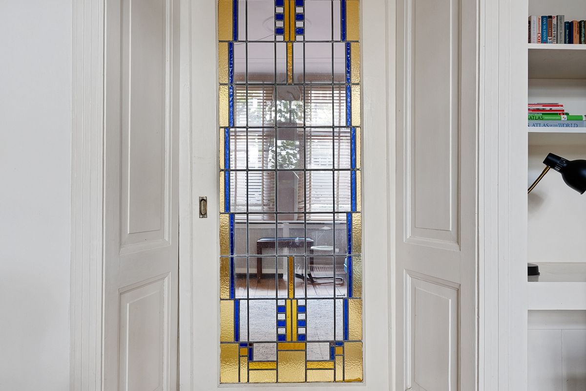 A beautiful stained-glass en-suite separates the front room from the living room.