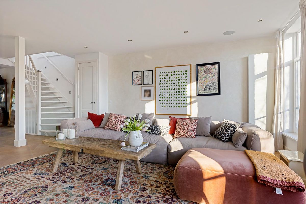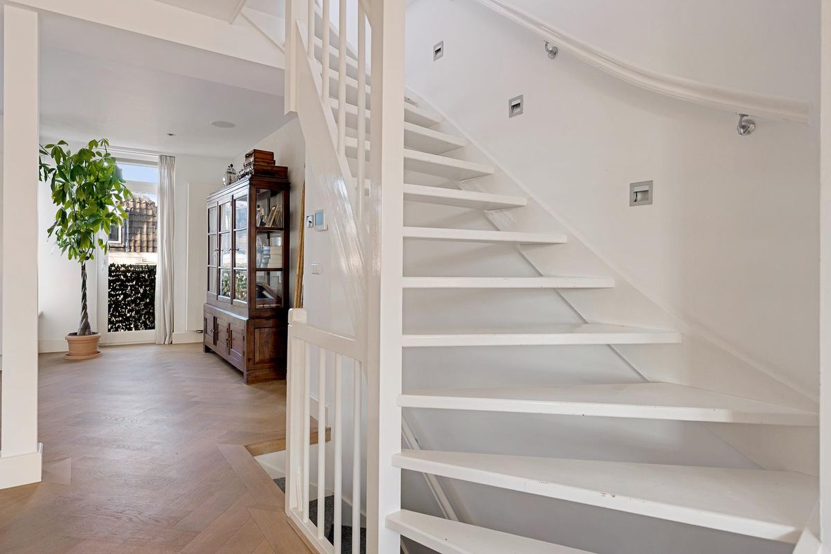 Via the neat communal staircase, you reach the private entrance on the second floor. A fixed internal staircase brings you to the third floor, where the main living area unfolds. The spacious living room at the front is the heart of the home. Thanks to its position in a gentle street curve and the wide windows, natural light floods the space beautifully. The view is open and private, you’re not looking directly into other homes, but rather along the charming street, creating a feeling of both openness and calm. The interior is refined, featuring a herringbone floor, built-in spotlights, and ceiling speakers, all contributing to a sense of understated luxury.