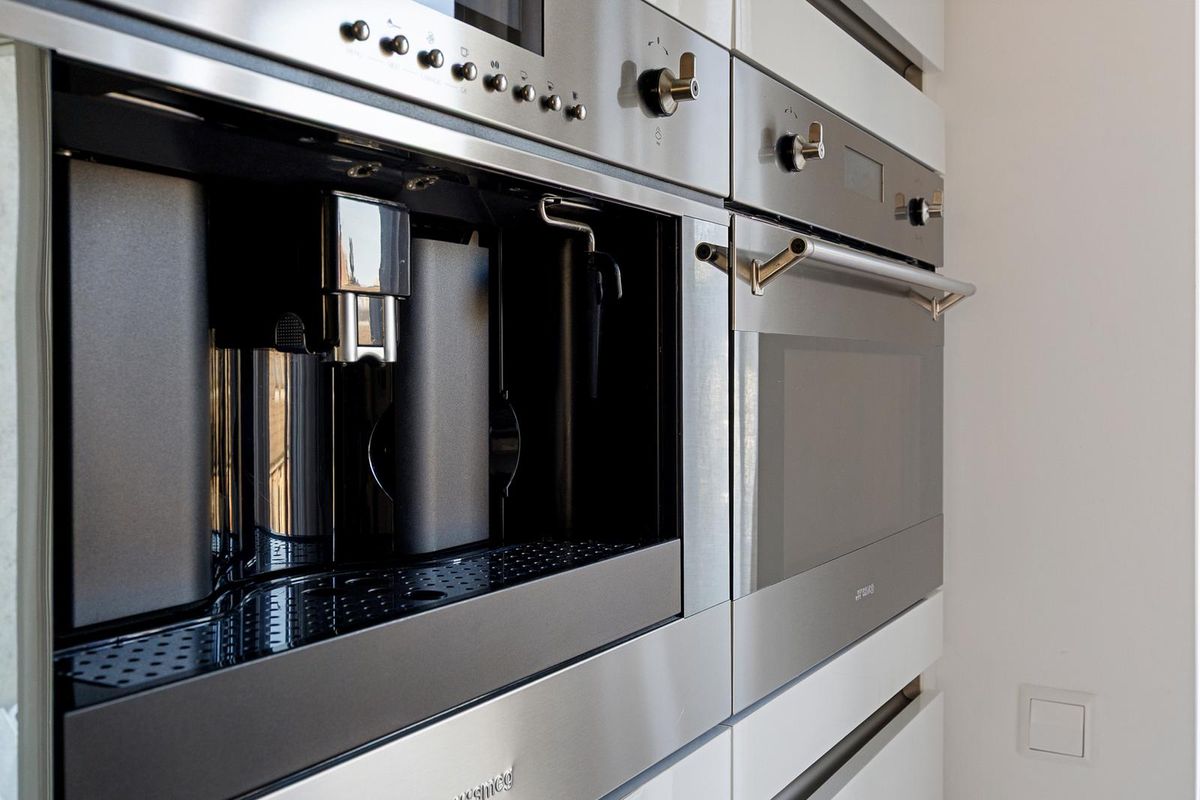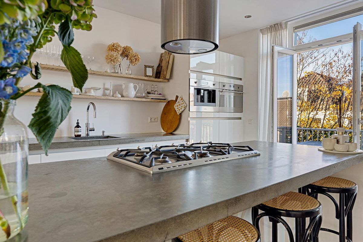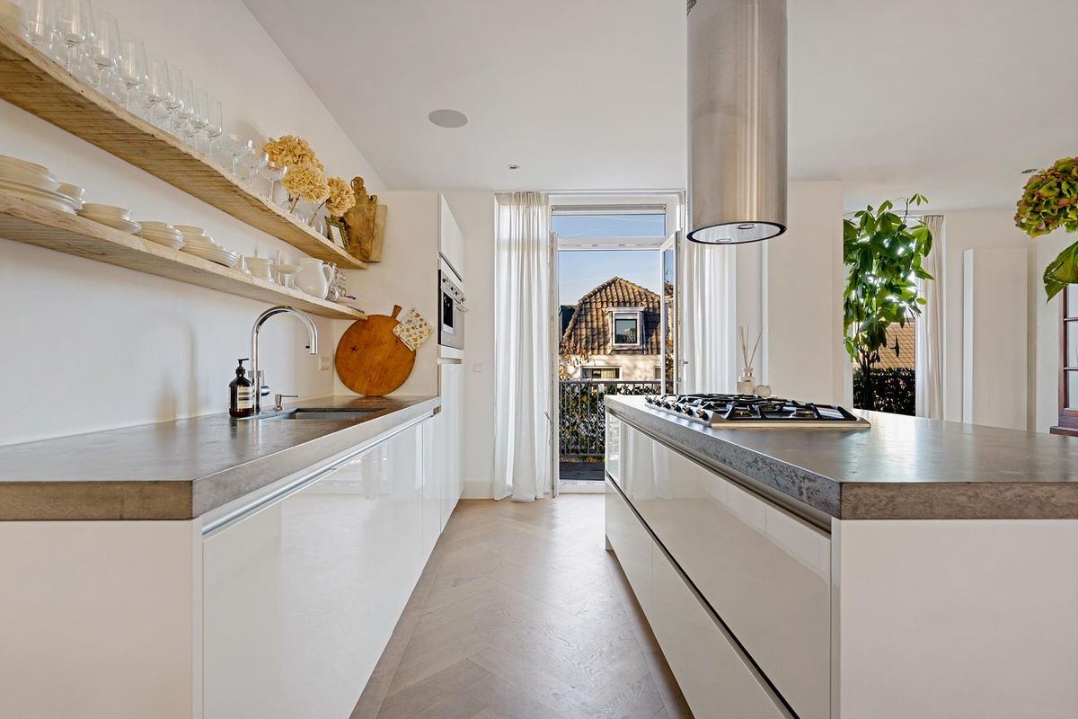 Aan de achterzijde bevindt zich de ruime woonkeuken, vernieuwd in 2015, voorzien van een kookeiland met bar, royale 5-pits gasfornuis, Quooker, Smeg inbouwkoffiemachine, afzuigkap, oven, vaatwasser, grote koelkast met vriesgedeelte en volop kastruimte. De openslaande deuren geven toegang tot het balkon aan de achterzijde, waar je overdag lekker in de zon rustig kunt lunchen.