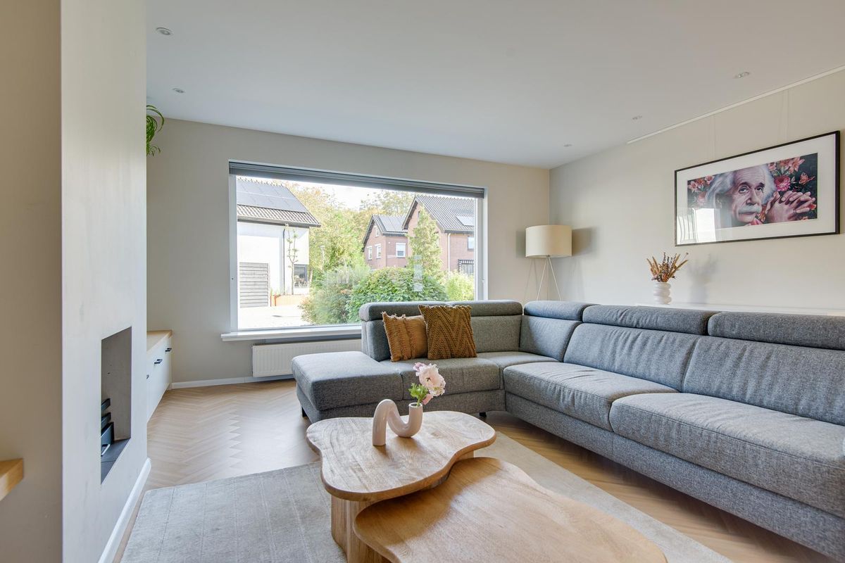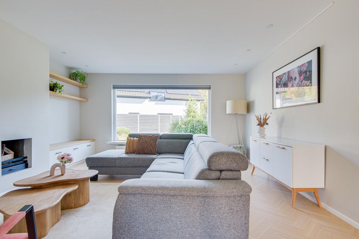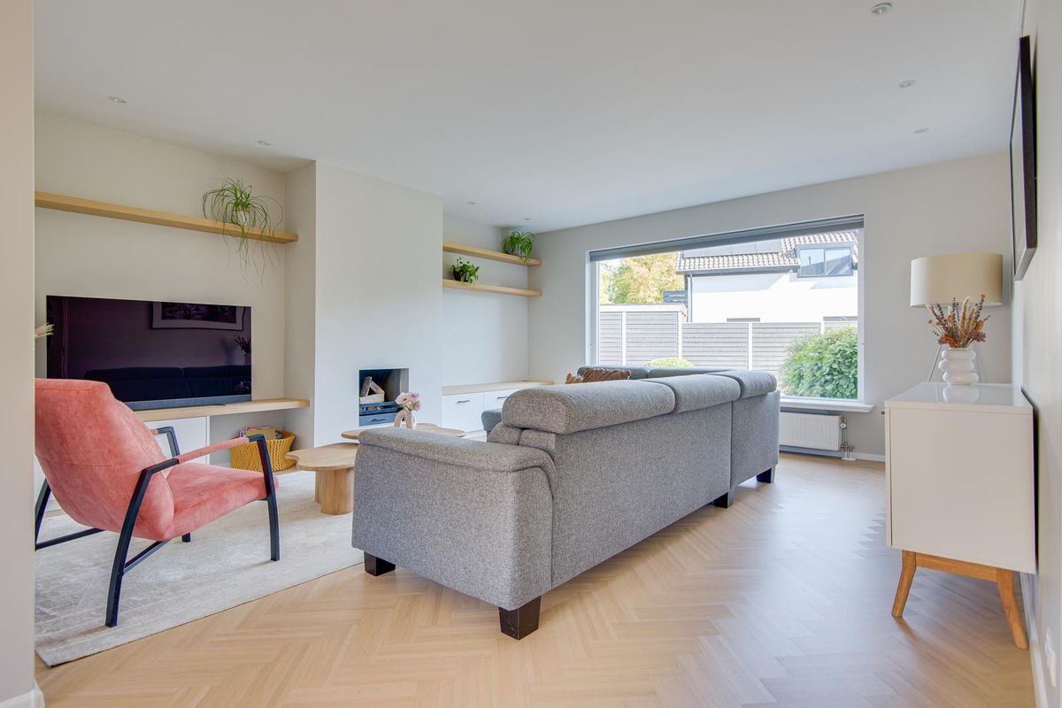 De ruime woonkamer is aan de voorzijde van de woning gelegen en is voorzien van een prachtige vloer, sfeervolle haard en heeft een leuk doorkijkje naar het Laningpark. De living kenmerkt zich door de strak gestuukte wanden en plafond met de inbouwspotjes als mooie toevoeging.
