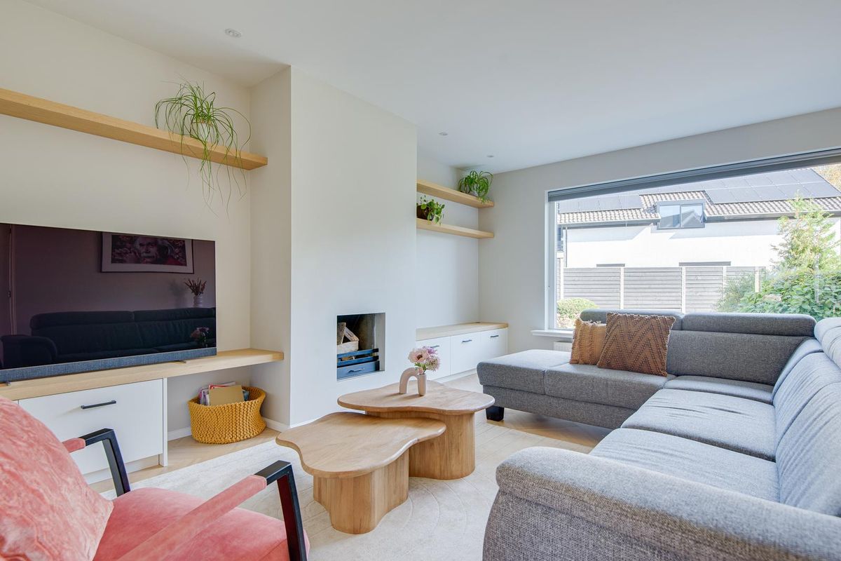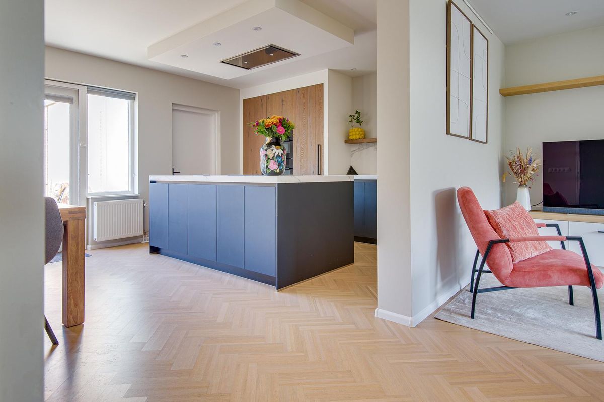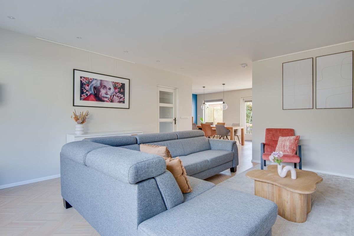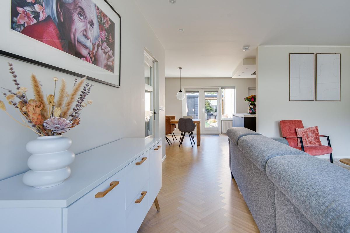 De ruime woonkamer is aan de voorzijde van de woning gelegen en is voorzien van een prachtige vloer, sfeervolle haard en heeft een leuk doorkijkje naar het Laningpark. De living kenmerkt zich door de strak gestuukte wanden en plafond met de inbouwspotjes als mooie toevoeging.