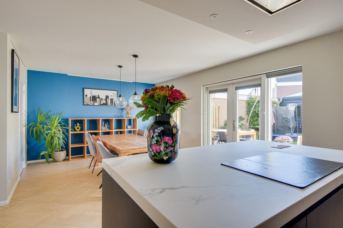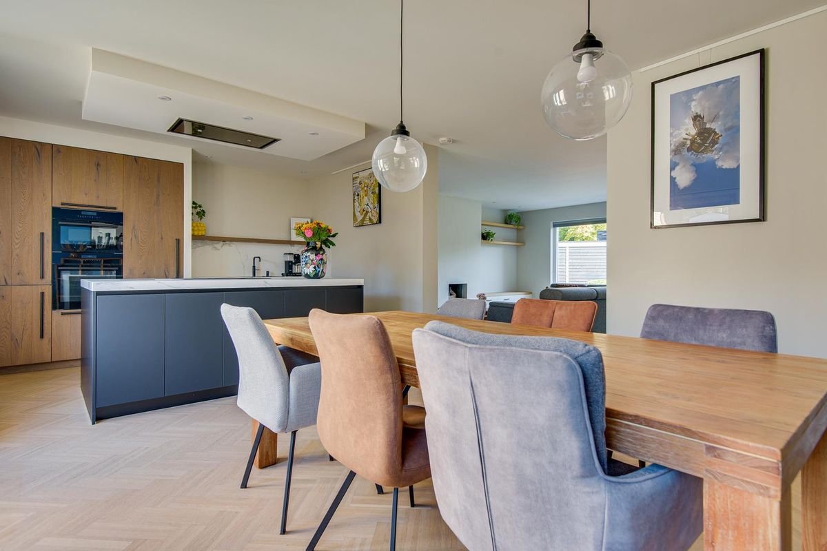 De royale leefkeuken met veel lichtinval is voorzien van een kookeiland met wandopstelling en beschikt over diverse apparatuur zoals een vaatwasser, Quooker, combimagnetron, oven, koel-vriescombinatie, inductiekookplaat en verschillende inbouwkasten en lades.