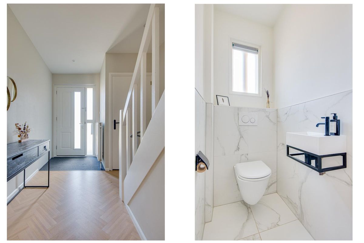 Entree/hal met trapopgang naar de eerste verdieping, toiletruimte, kelder, gemoderniseerde meterkast (3 fase-aansluiting) en toegang tot de woonkamer en keuken.