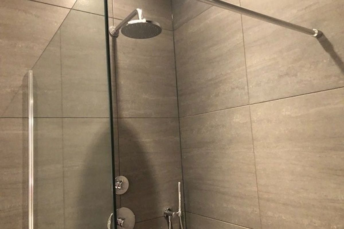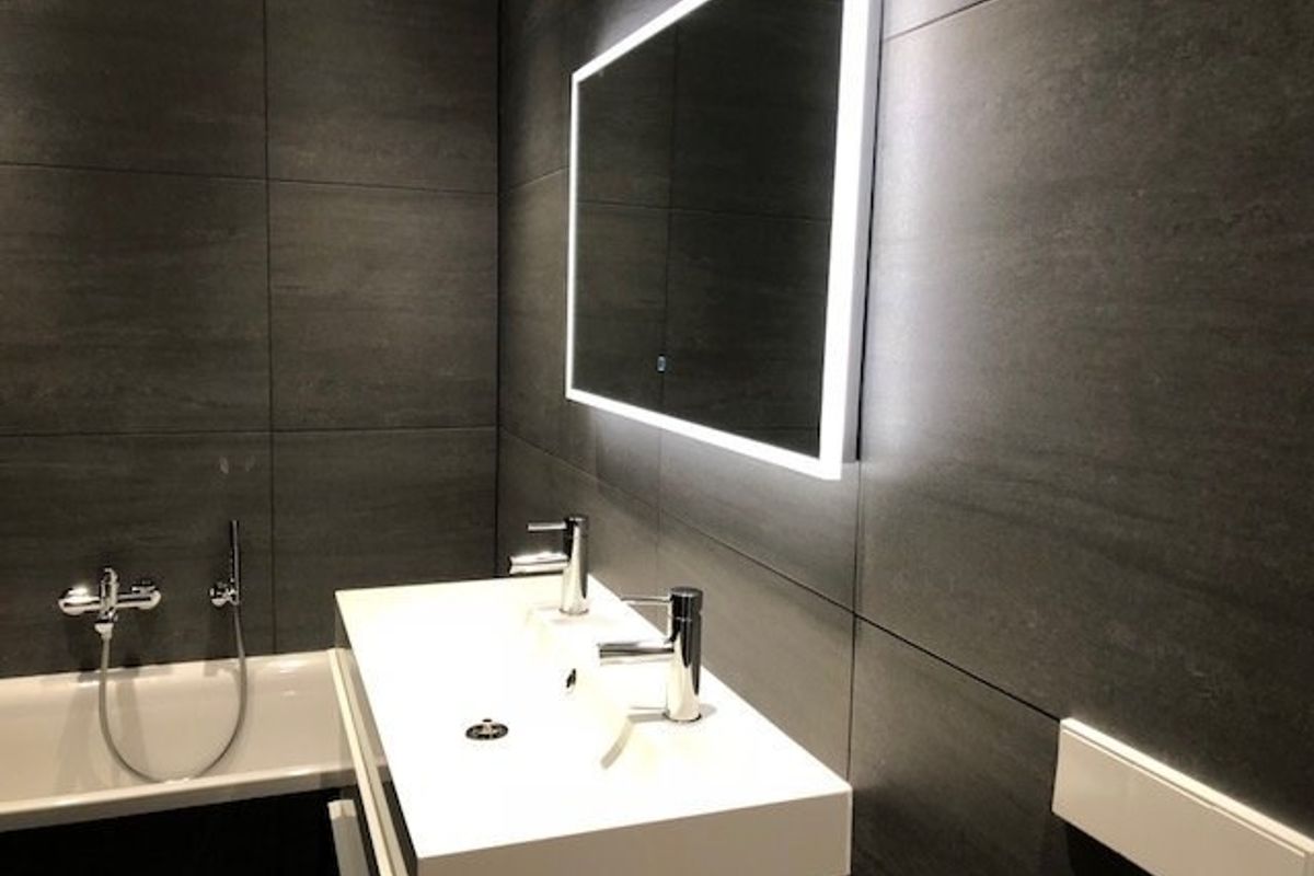 De badkamer is zeer fraai en heeft een aparte een regendouche, een bad en dubbele wastafel met spiegel.