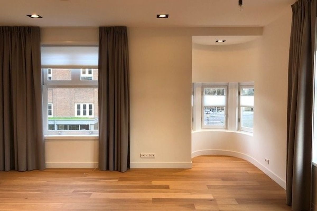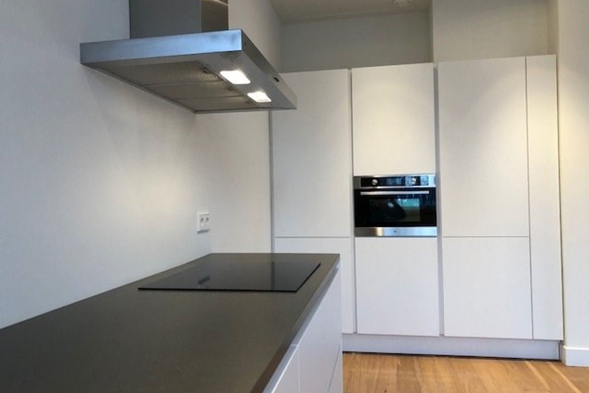 The hall gives access to the spacious living room overlooking the water. The corner apartment has windows at the front and on the side so the living room is very bright. In the entire apartment there are new linen-look curtains and luxaflex for the windows. In the living room is a beautiful oak floor.