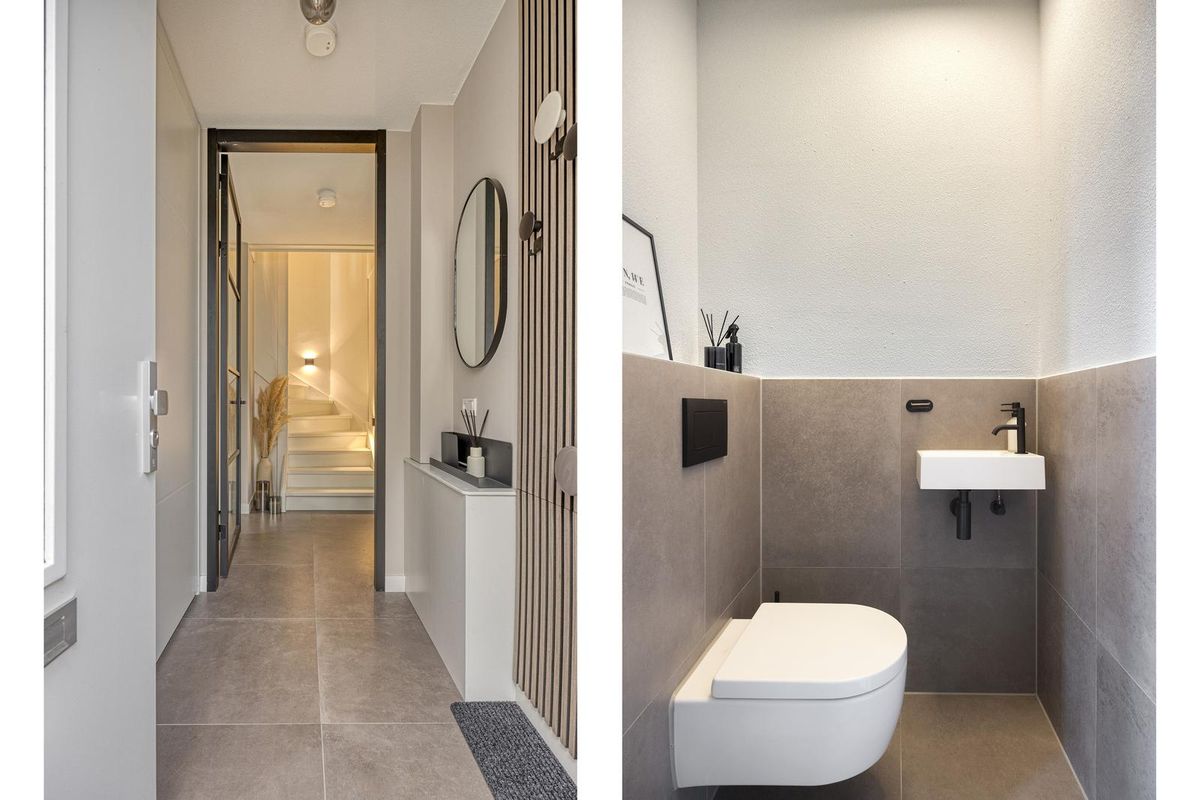 Entreehal met meterkast, toiletruimte en openslaande deur naar de woonkamer. De lichte woonkamer (ca. 20 m²) is aan de straatzijde gelegen en staat in verbinding met de moderne open woonkeuken, welke toegang biedt tot de verzorgde achtertuin. Tussen de woonkamer en woonkeuken is de vaste trap naar de eerste verdieping gelegen, met trapkast welke dient als provisieruimte.