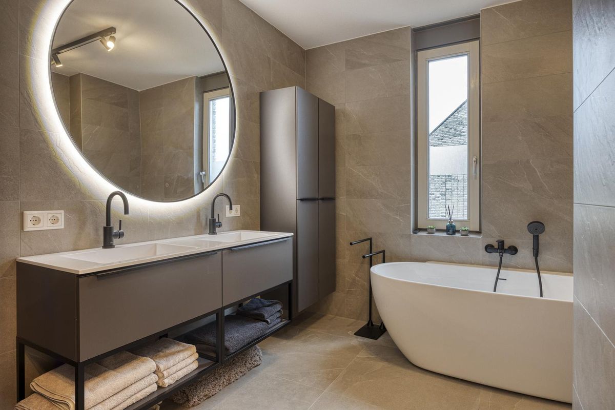De luxe badkamer (ca. 9 m²), is volledig betegeld en voorzien van een ligbad, inloopdouche en wastafelmeubel met dubbele wasbak.