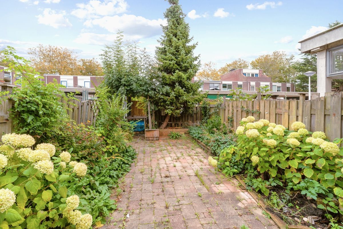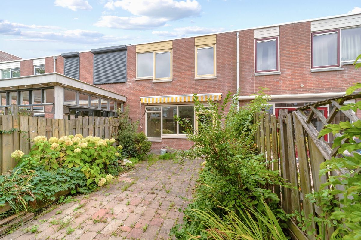 Een overkapping op het westen aan de voorzijde en ook nog een fraai aangelegde achtertuin gelegen op het oosten met achterom en een carport. De achtertuin is ca. 41 m2. Meer dan voldoende ruimte om buiten te vertoeven met nagenoeg elk moment van de dag keuze tussen zon of schaduw.