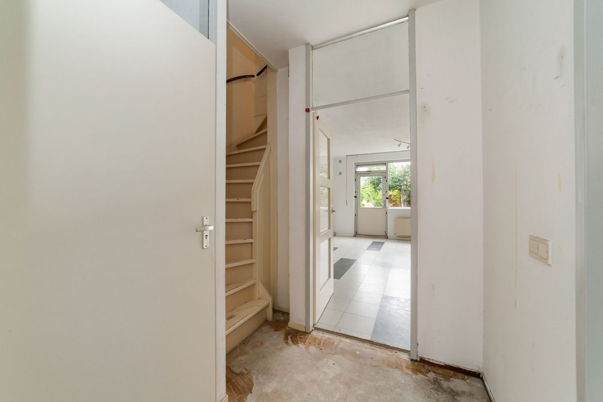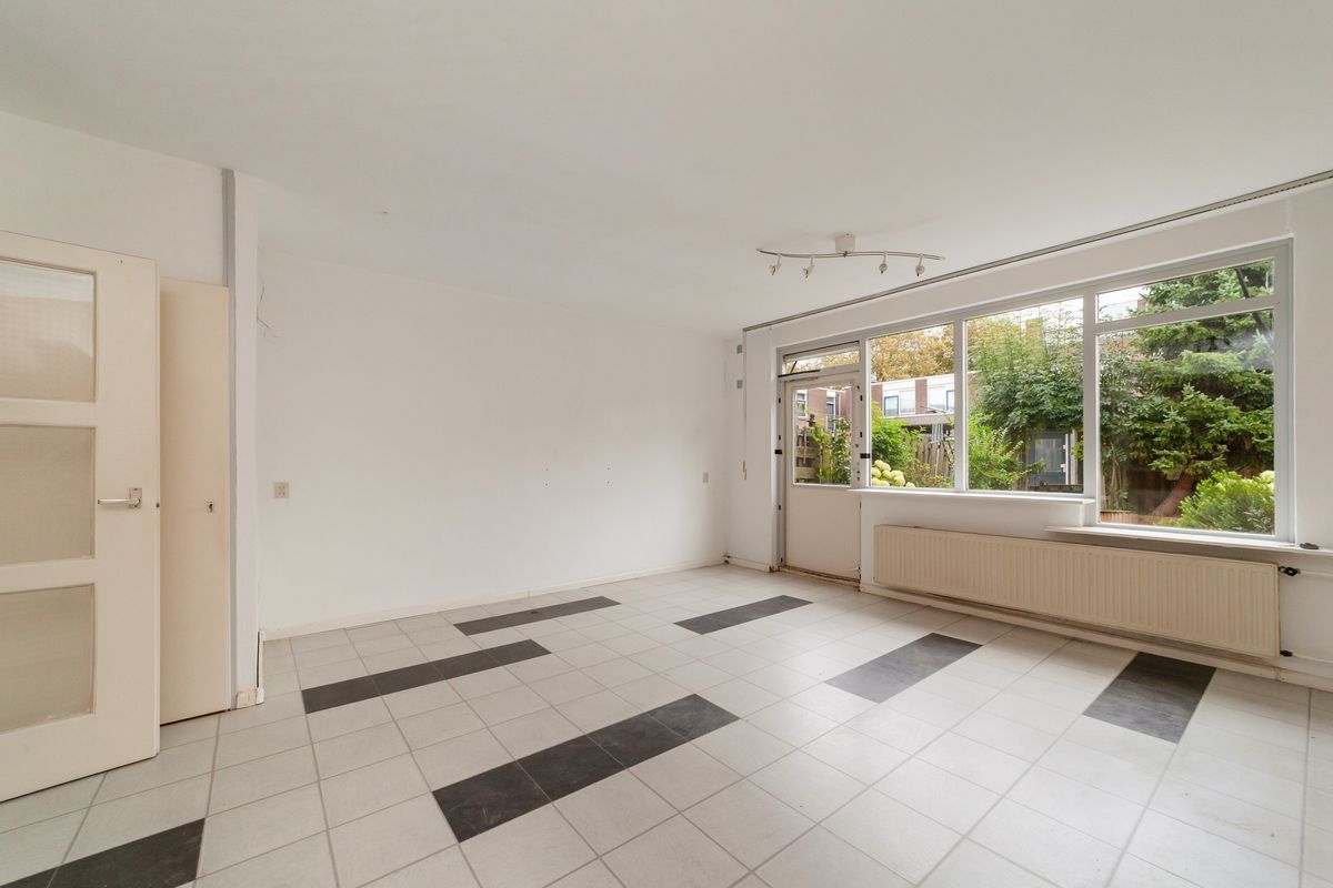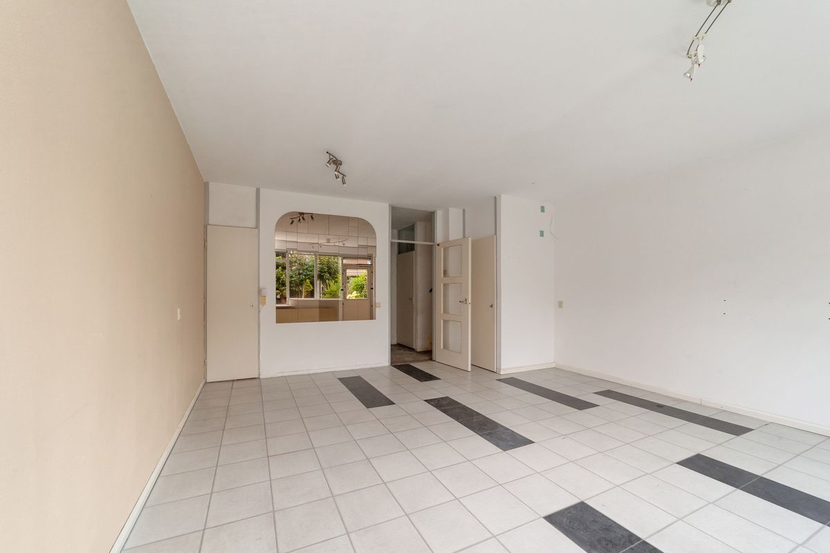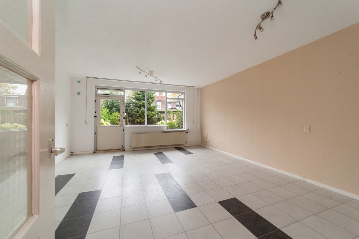 Aan de achterzijde tref je de fijne tuingerichte woonkamer. Op dit moment is deze gesloten ten opzichte van de keuken, maar de indeling is eenvoudig aan te passen zodat er een geheel open of half-open keuken kan ontstaan. De woonkamer van ca. 27 m2 is voorzien van laminaattegels, deur naar de achtertuin, trapkast en een bergkast.