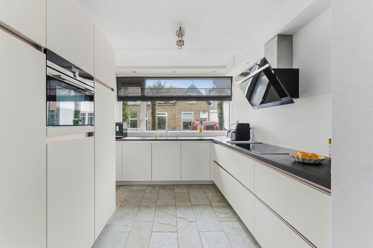 Keuken: De open keuken zit aan de voorzijde van woning, waar je leuk uitkijkt over de Pijlstoep. De keuken is ingericht met diverse inbouwapparatuur, waaronder een inductiekookplaat, afzuigkap, combi-oven/magnetron, koelkast, Quooker, vriezer en vaatwasser. De keuken is afgewerkt met Bokmerk aluminium op de vensterbank en achterwand. Er is genoeg werk- en bergruimte om het kook- en bakgerei op te bergen.