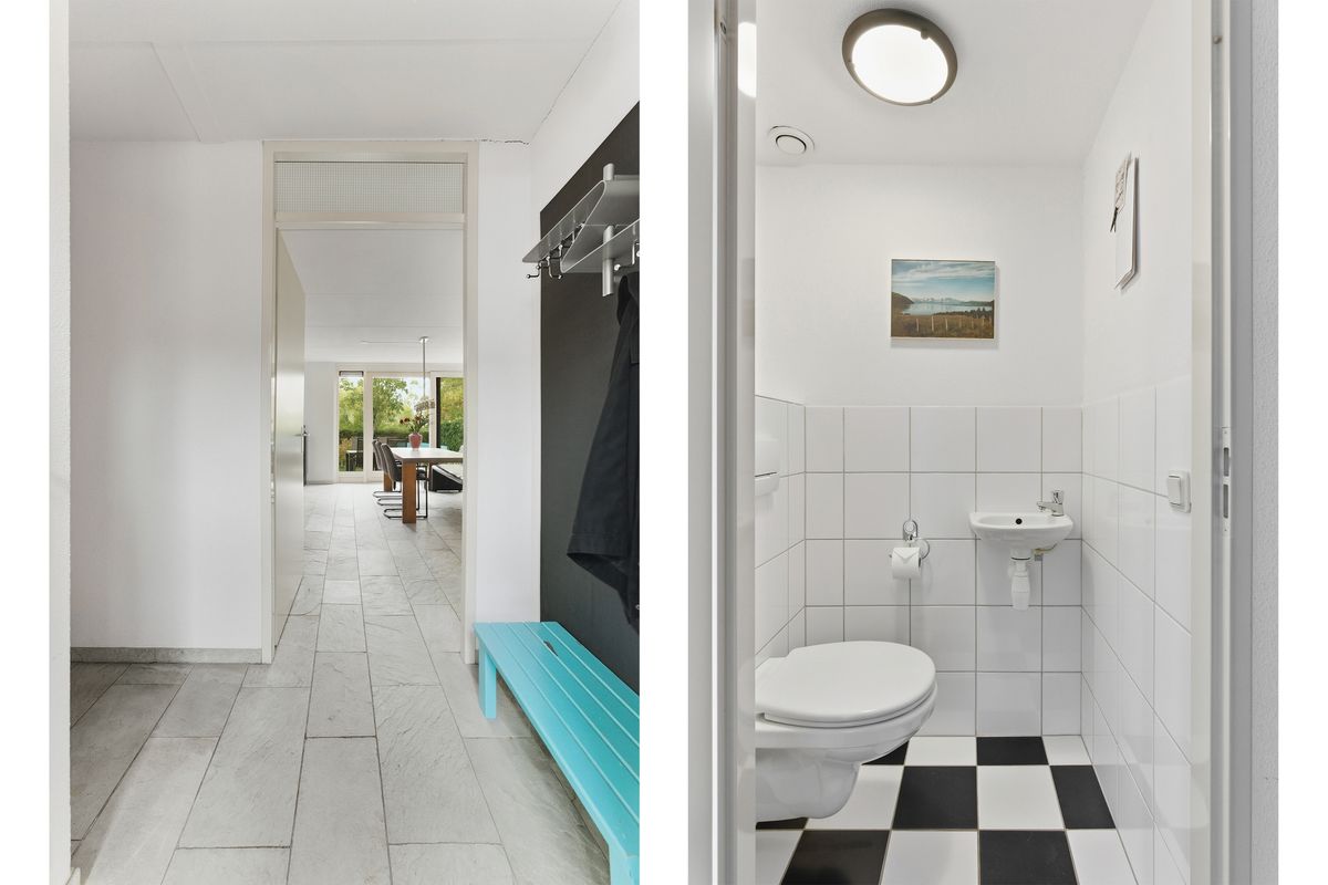 Toilet: De nette toiletruimte is gedeeltelijk betegeld en voorzien van een zwevend closet, een fonteintje en mechanische ventilatie. De geblokte tegels geven dit lichte toilet een leuke touch.