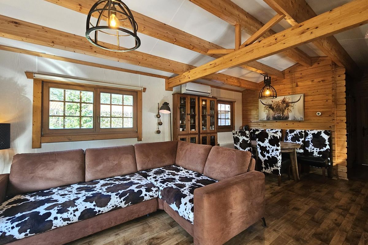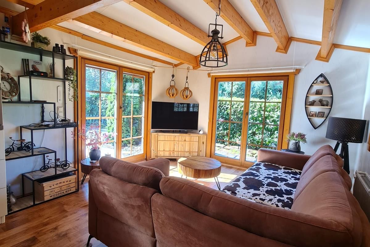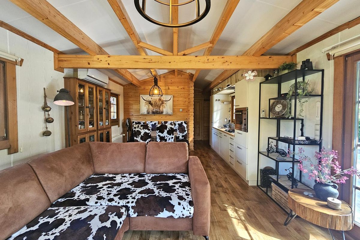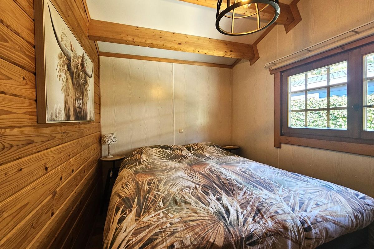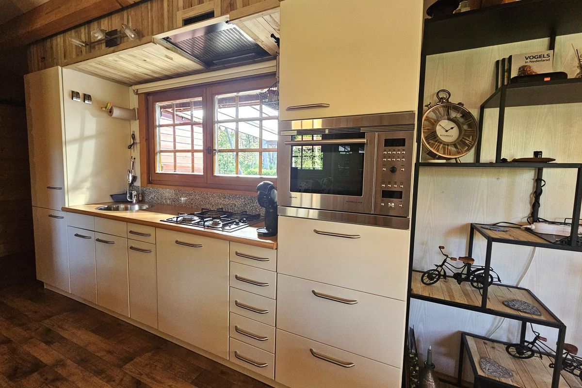 Indeling: Entree, hal met toegang tot alle vertrekken. De sfeervolle woonkamer springt direct in het oog door de vele houten details: fraaie balkenplafonds, houten kozijnen en ramen met luiken die zorgen voor een warme, landelijke sfeer. Grote raampartijen en openslaande deuren naar het terras brengen het buitengevoel naar binnen en bieden prachtig uitzicht op de tuin en het groen. De woonkamer is uitgerust met een airco (verwarmen/koelen), een royale hoekbank met slaapfunctie en een eettafel met stoelen. De open keuken sluit mooi aan op de woonkamer en is volledig ingericht met een 4-pits kookplaat, afzuigkap, combi-magnetron, vaatwasser, koel-/vriescombinatie en een 10-liter boiler. Het chalet beschikt over twee slaapkamers. De ouderslaapkamer is voorzien van een boxspring (160 x 210 cm) met opbergruimte en een vaste inbouwkast. De tweede slaapkamer is ingericht met een tweepersoonsbed (140 x 200 cm) en is prima geschikt als logeer- of kinderkamer. De badkamer is volledig betegeld en voorzien van een douche met Grohe thermostaatkraan, wastafel, toilet en ventilatiesysteem.