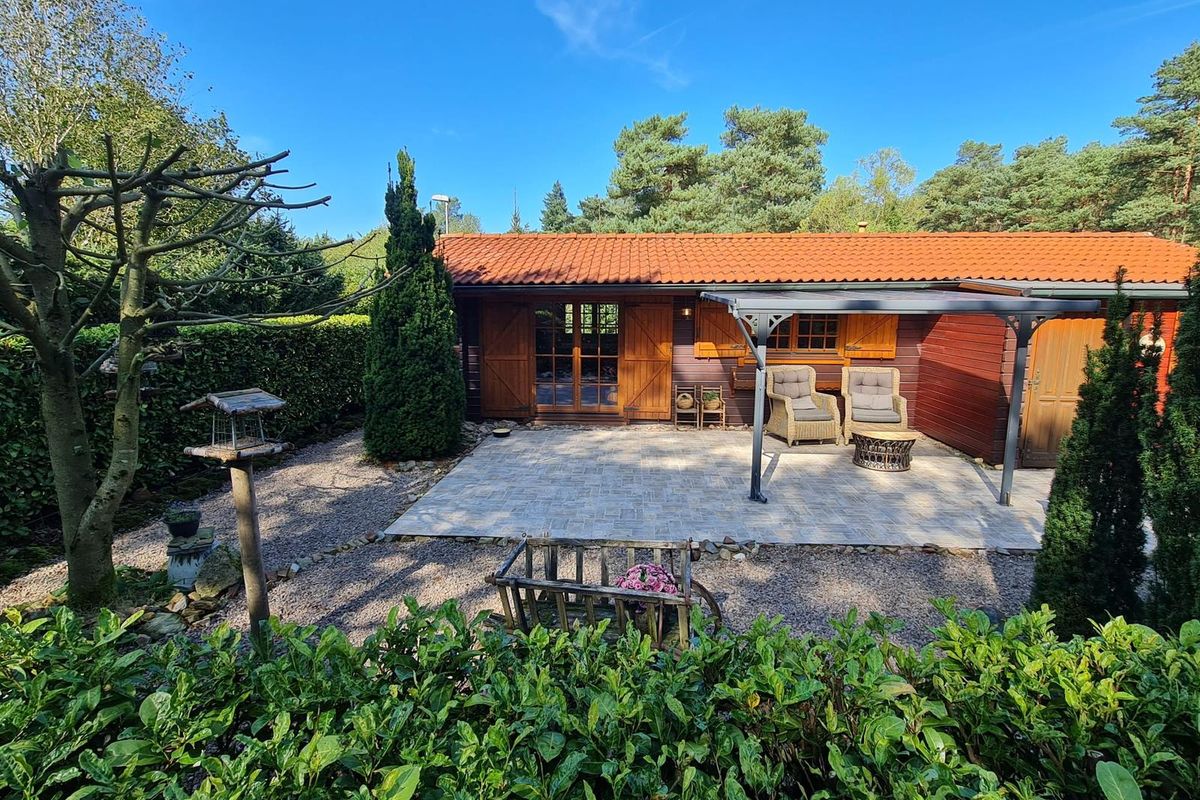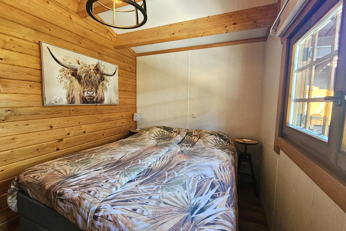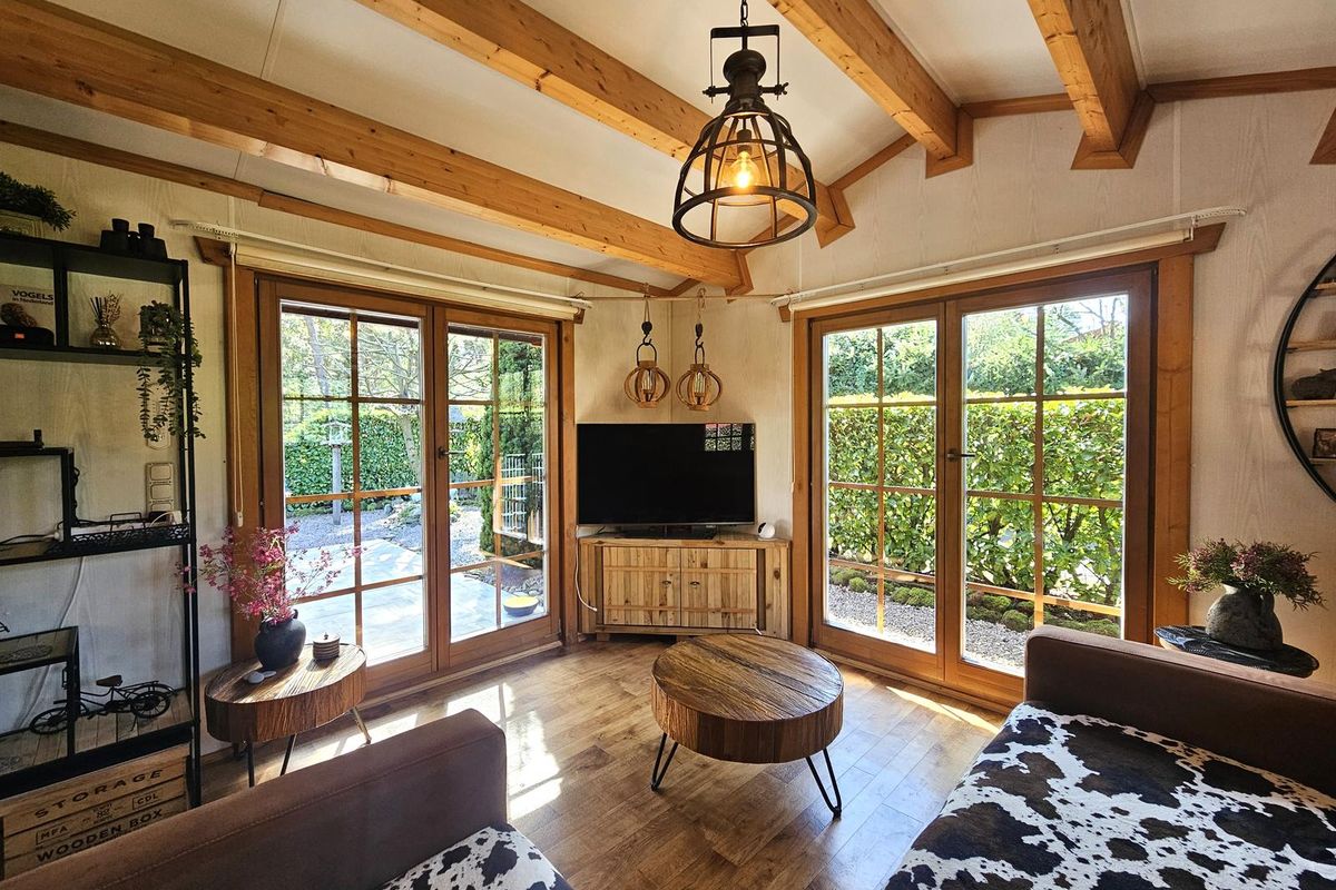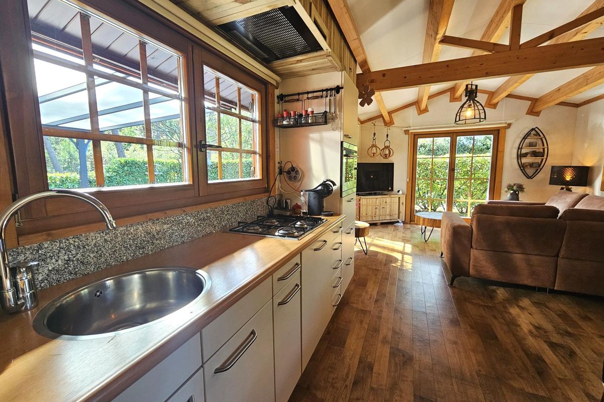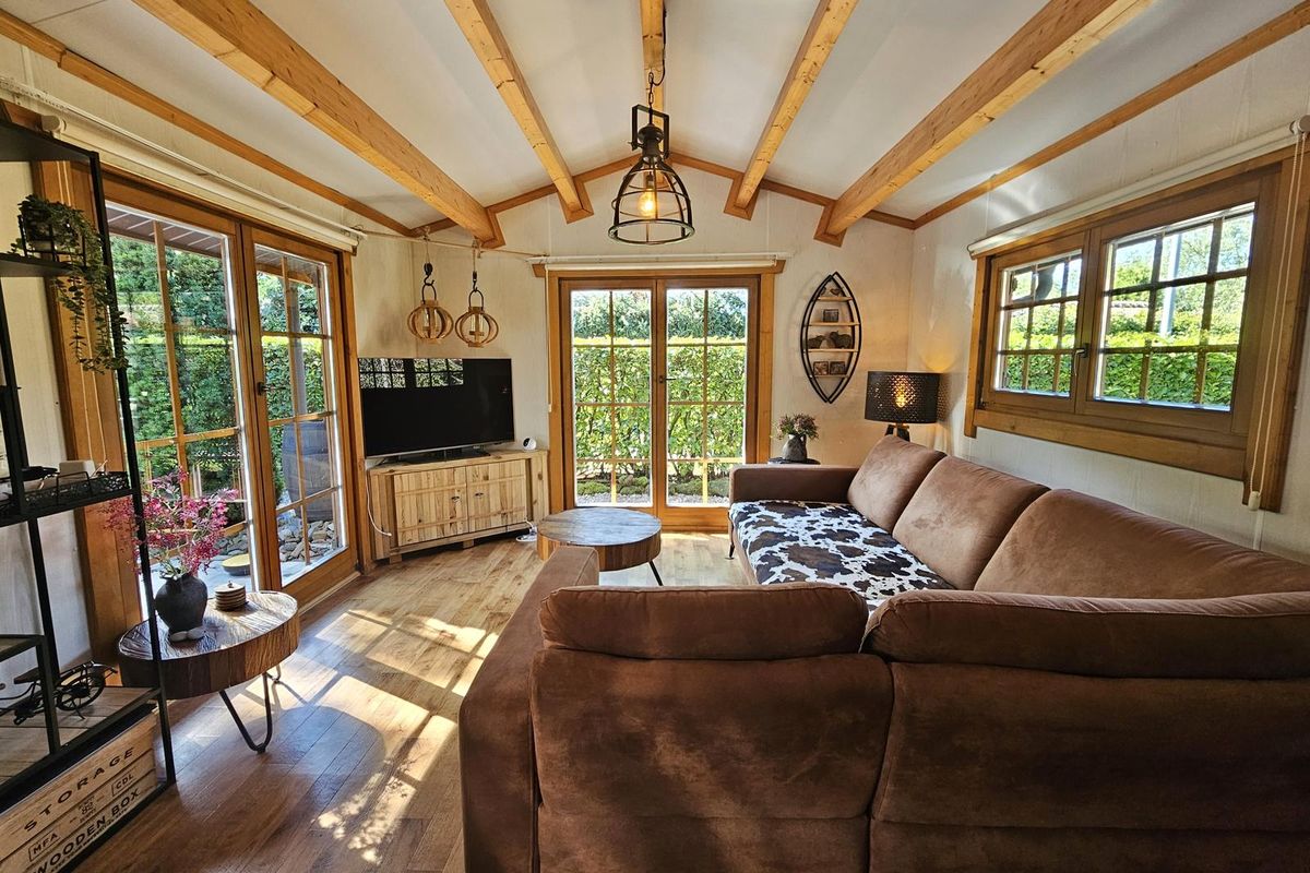 Indeling: Entree, hal met toegang tot alle vertrekken. De sfeervolle woonkamer springt direct in het oog door de vele houten details: fraaie balkenplafonds, houten kozijnen en ramen met luiken die zorgen voor een warme, landelijke sfeer. Grote raampartijen en openslaande deuren naar het terras brengen het buitengevoel naar binnen en bieden prachtig uitzicht op de tuin en het groen. De woonkamer is uitgerust met een airco (verwarmen/koelen), een royale hoekbank met slaapfunctie en een eettafel met stoelen. De open keuken sluit mooi aan op de woonkamer en is volledig ingericht met een 4-pits kookplaat, afzuigkap, combi-magnetron, vaatwasser, koel-/vriescombinatie en een 10-liter boiler. Het chalet beschikt over twee slaapkamers. De ouderslaapkamer is voorzien van een boxspring (160 x 210 cm) met opbergruimte en een vaste inbouwkast. De tweede slaapkamer is ingericht met een tweepersoonsbed (140 x 200 cm) en is prima geschikt als logeer- of kinderkamer. De badkamer is volledig betegeld en voorzien van een douche met Grohe thermostaatkraan, wastafel, toilet en ventilatiesysteem.