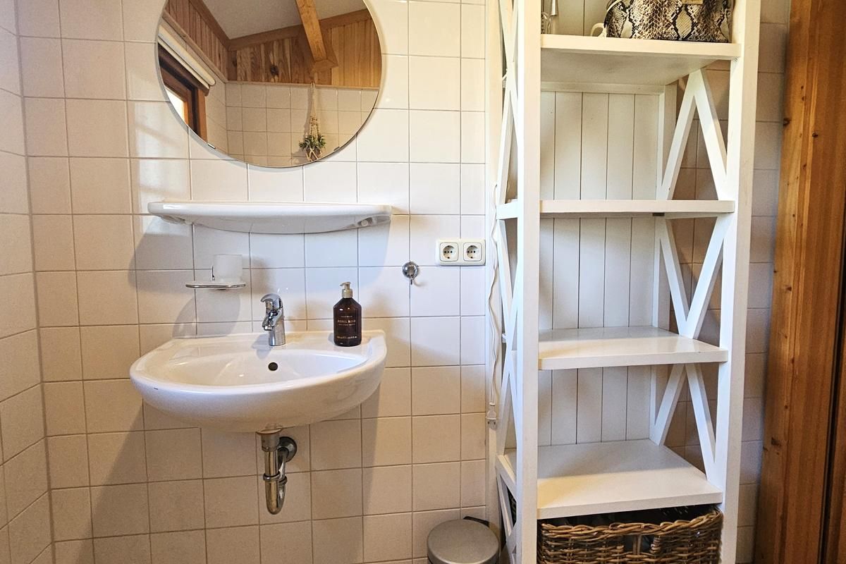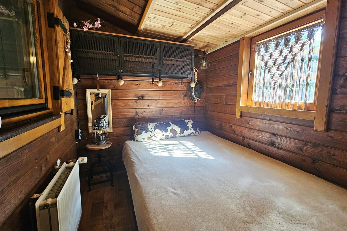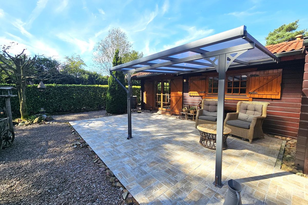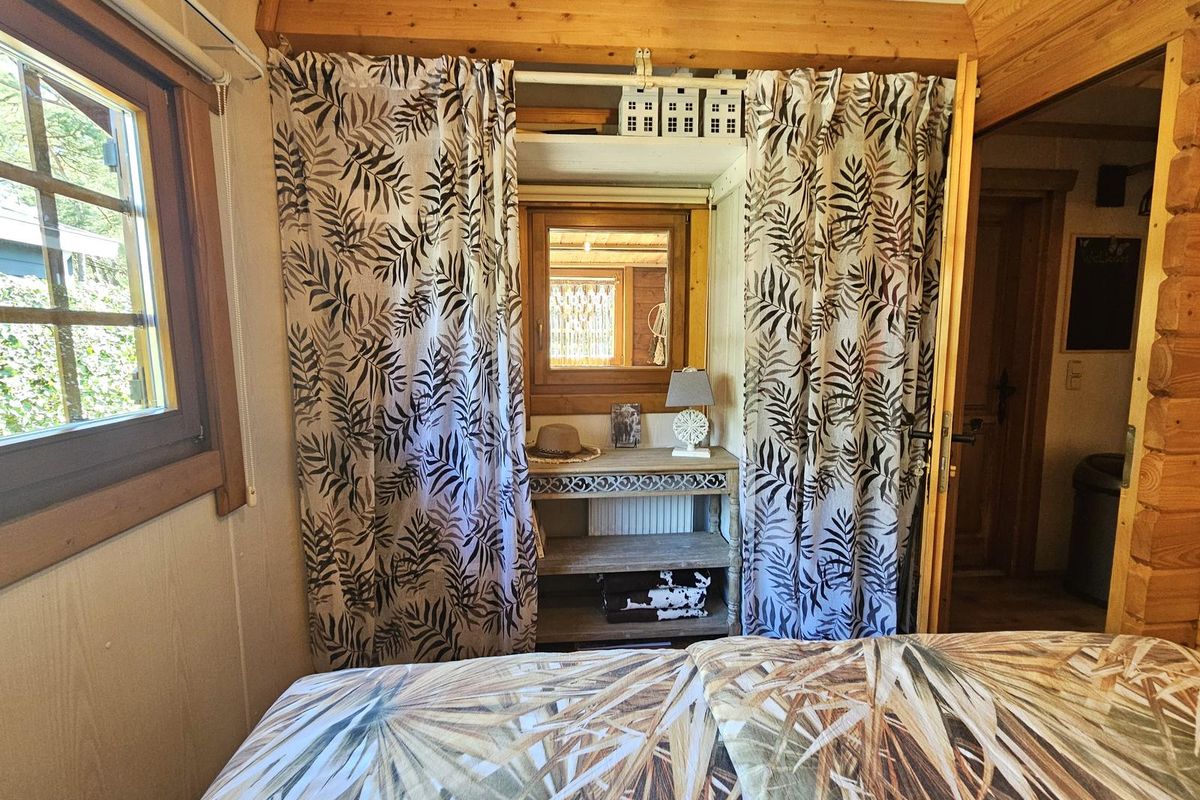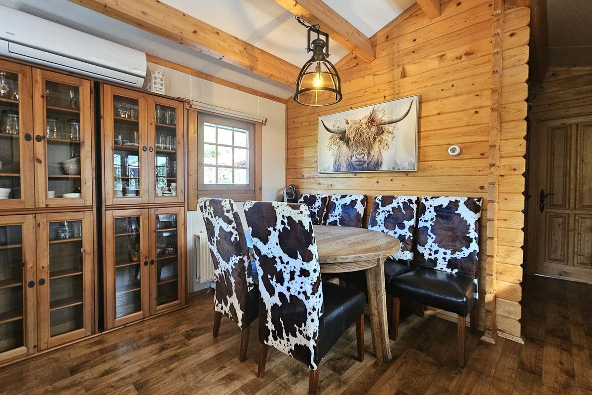 Indeling: Entree, hal met toegang tot alle vertrekken. De sfeervolle woonkamer springt direct in het oog door de vele houten details: fraaie balkenplafonds, houten kozijnen en ramen met luiken die zorgen voor een warme, landelijke sfeer. Grote raampartijen en openslaande deuren naar het terras brengen het buitengevoel naar binnen en bieden prachtig uitzicht op de tuin en het groen. De woonkamer is uitgerust met een airco (verwarmen/koelen), een royale hoekbank met slaapfunctie en een eettafel met stoelen. De open keuken sluit mooi aan op de woonkamer en is volledig ingericht met een 4-pits kookplaat, afzuigkap, combi-magnetron, vaatwasser, koel-/vriescombinatie en een 10-liter boiler. Het chalet beschikt over twee slaapkamers. De ouderslaapkamer is voorzien van een boxspring (160 x 210 cm) met opbergruimte en een vaste inbouwkast. De tweede slaapkamer is ingericht met een tweepersoonsbed (140 x 200 cm) en is prima geschikt als logeer- of kinderkamer. De badkamer is volledig betegeld en voorzien van een douche met Grohe thermostaatkraan, wastafel, toilet en ventilatiesysteem.